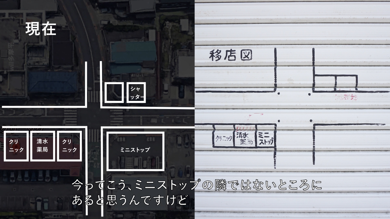そのシャッターには「清水薬局の移転先のお知らせ」と書かれてあり、目の前の十字路の地図が描かれている。しかし、移転先と書かれた場所に清水薬局は見つからない。少し周辺を見渡してみるとなんと別の場所に清水薬局が存在する。