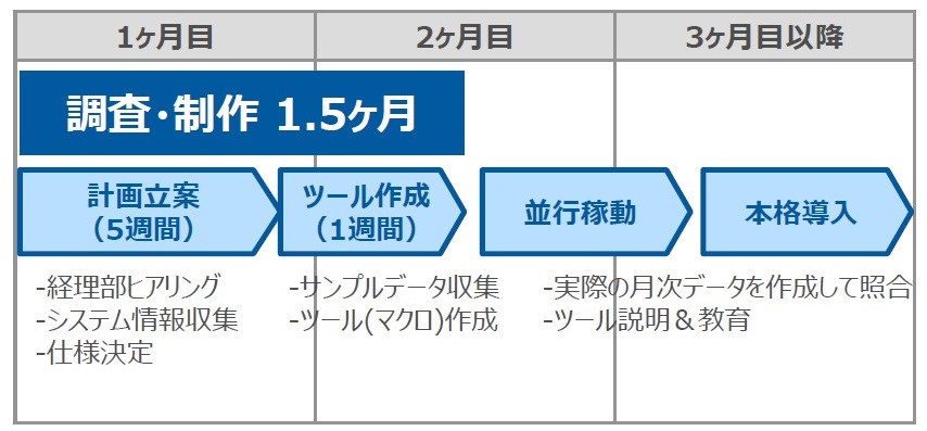 経理部門の方々へのヒアリングと使用している会計システムの現状把握をさせていただき、プロセスの改善案と作成するツールの仕様決定を行いました。