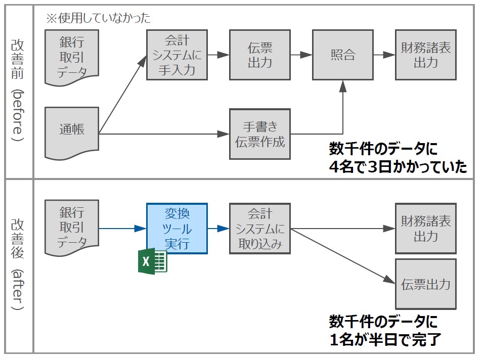 改善後は、銀行の取引データを会計システムに取り込めるように変換ツールをExcelにて作成しました。