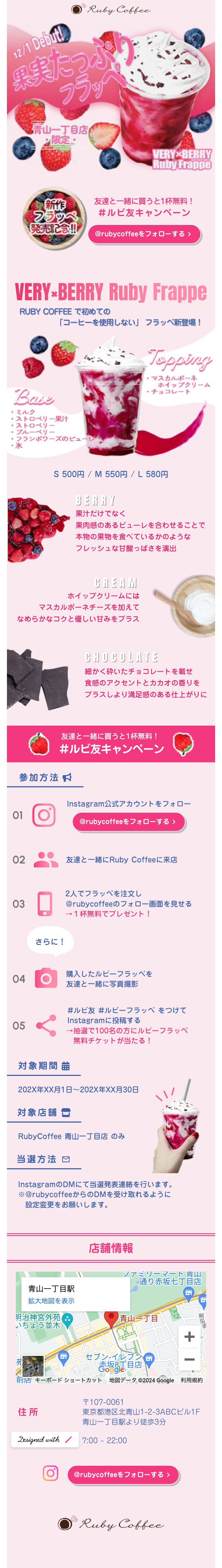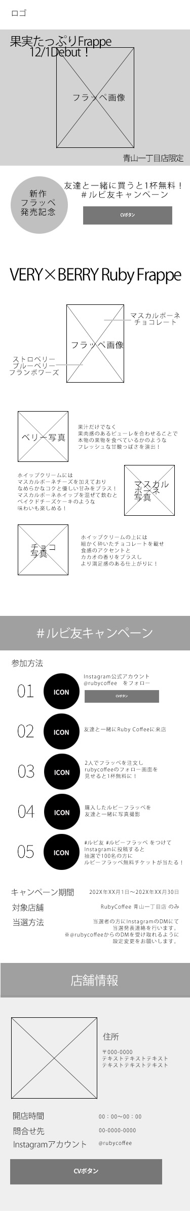 ・CVがInstagramのフォローの獲得だったので、CTAボタンを3つ設けた。情報を見ていく流れで自然に押せるような場所に設けた。