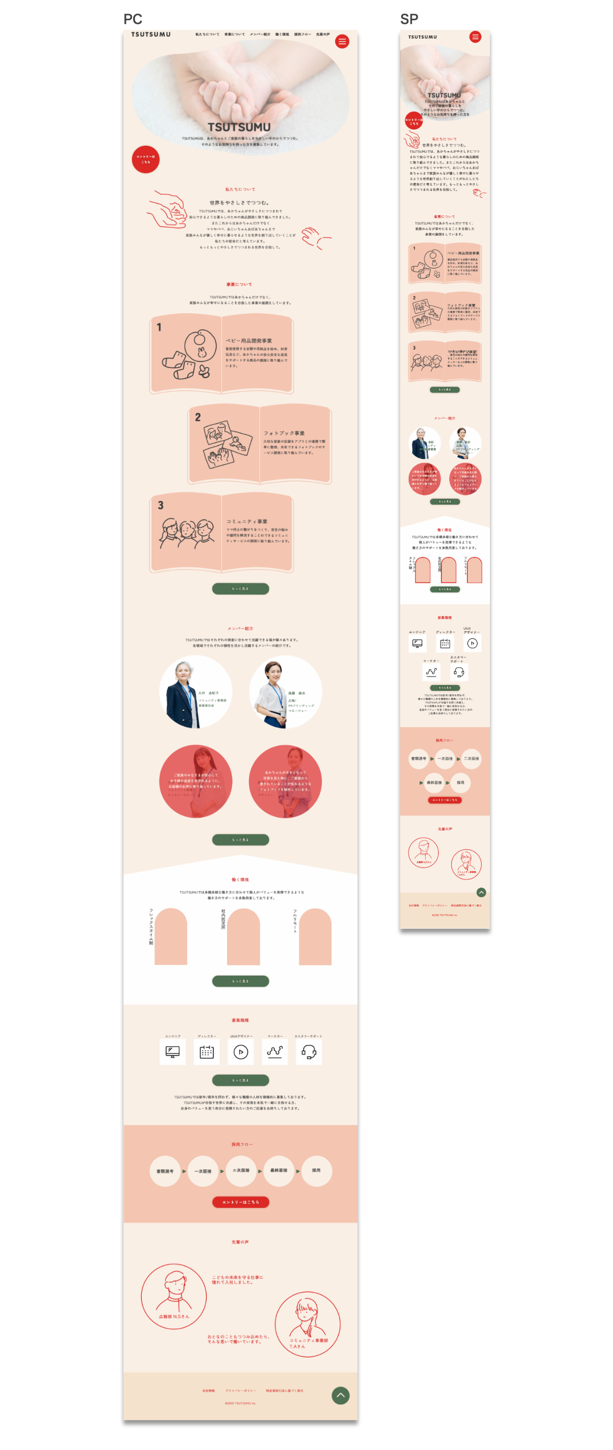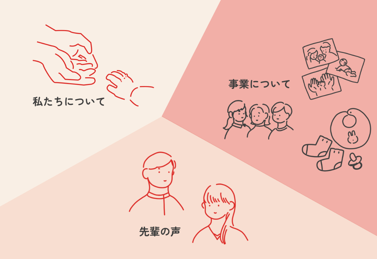 「私たちについて」というセクションでは、あかちゃんを迎え入れるご家族の両手とご家族に向かって一生懸命に手を伸ばすあかちゃんの様子を描きました。TSUTSUMUではコミュニティ支援などの子育て環境の支援も目指していることから、幸せな瞬間だけでなく、そこにたどり着くまでの過程にも心を配り、サポートするという要素を加えるご提案をしました。