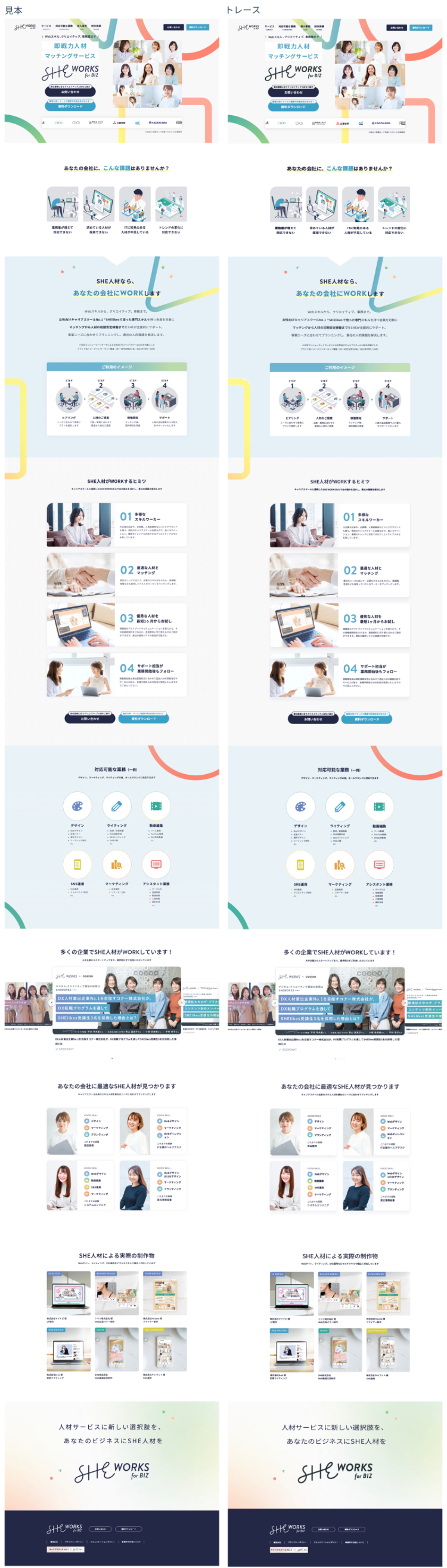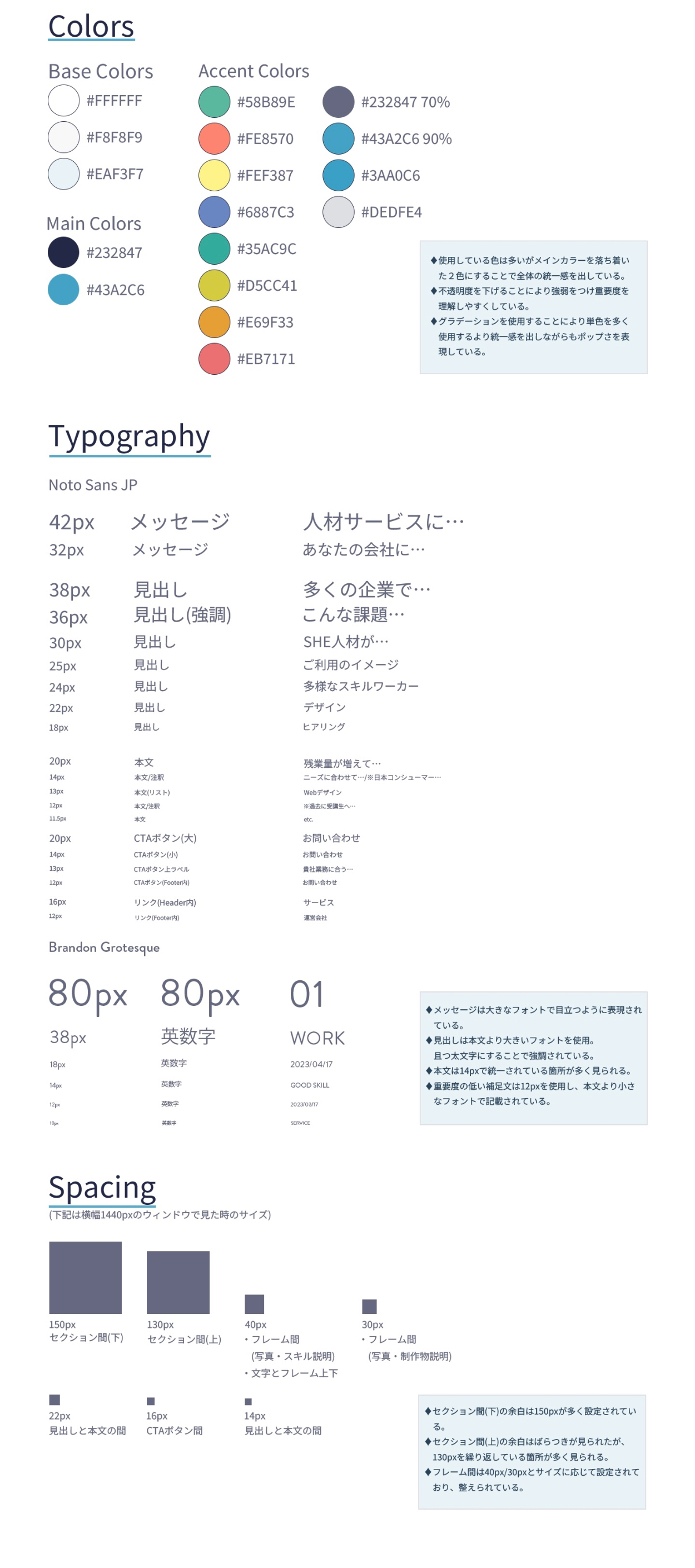 SHElikes Proデザイナーコース3つ目の課題にて、Webサイトトレースに取り組みました。検証ツールを使用しながらWebサイトをトレースし、スタイルガイドの作成と、PCとSPで異なるレイアウトの分析を行い、分析結果をまとめました。 使用ツール | Photoshop