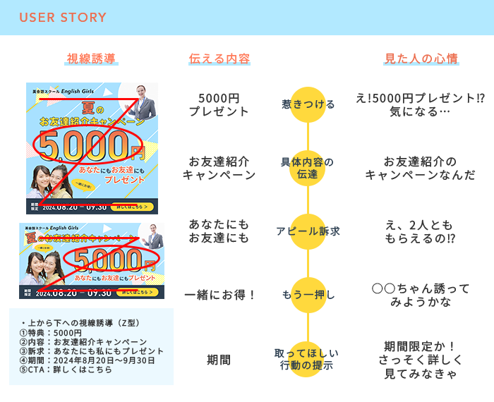 ペルソナ設定で想定したライフスタイル・心理状態から、”友達と一緒にお得に英会話を始められたら…”という潜在ニーズを持つ層に響くよう、以下の構成で訴求します。