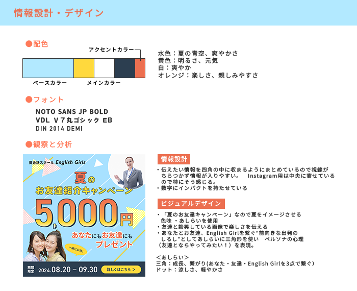 ・0から1の制作を通して、改めてその大変さを実感しました。バナーデザイン制作の前に、ペルソナやストーリーを深く検討し、情報設計やビジュアルデザインの根拠を明確にすることで、素材の選択や取捨選択に迷いがなくなり、スムーズに制作を進められると学びました。