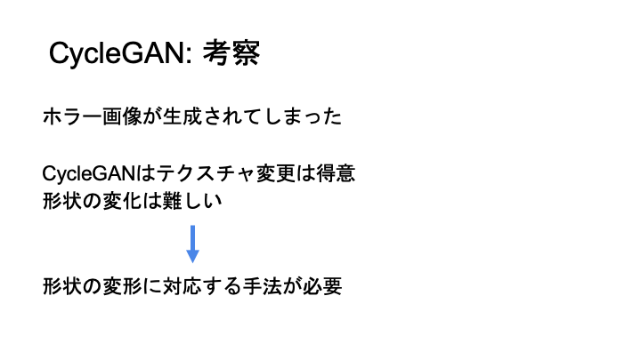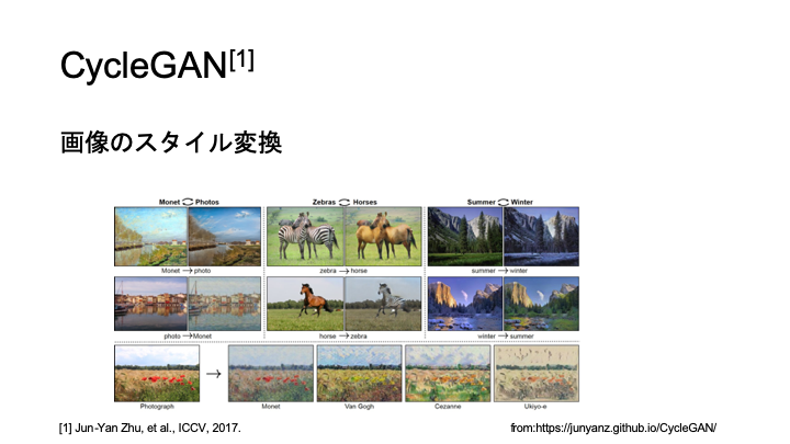 CycleGANはスタイル転写ができます.具体的な例として,CycleGANの公式GitHubでは馬 <=> しまうまや夏 <=> 冬のように画像の輪郭を保持したまま輪郭内のテクスチャ等を変更させる(スタイル変換)ことでこれら双方向の変化を実現させることができています(凄い!).このことを利用して,一般人の体をムキムキにしようと考えました.