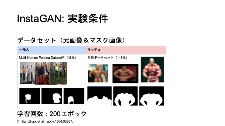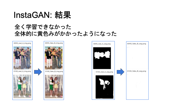 ただし,InstaGANの原著論文では学習させる部分(スカートやズボン)などが切り抜かれたデータ(マスクデータ)を膨大な量学習で使っている反面,自分たちの班ではこれらのデータセットをすべて自作する必要がありました.