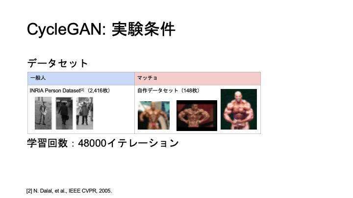 想定した状況は,(入力) 一般人画像 ===> (出力) 一般人がマッチョになった画像が出てくる感じです.使用したのはCycleGANです.