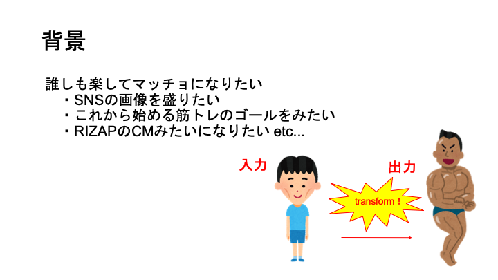 表向きのモチベーションはこんな感じだと思います.実際,自分が調べた中ではマッチョになれるアプリなどは存在せず(子供っぽくなったり,性別変換等のアプリはある),できるのかどうか気になったのでディープラーニングでやってみようという形になりました.この発表では特に,深層生成モデルであるGANを使ってこれを実現しようと試みました.