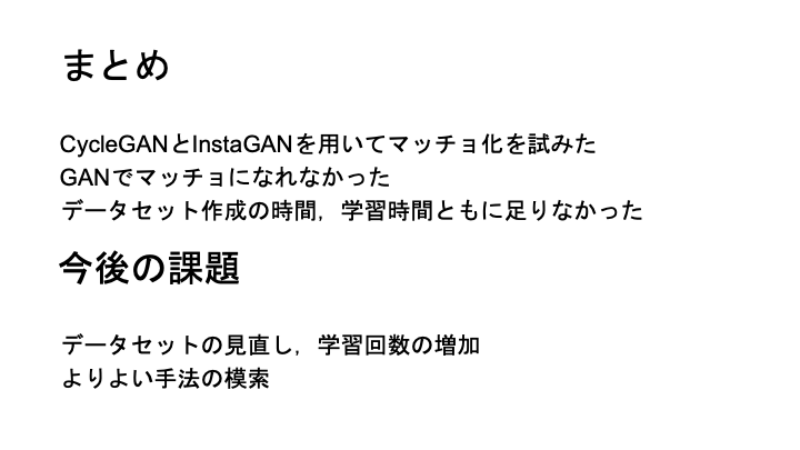 まとめはこんな感じで,結果的にCycleGANでもInstaGANでもマッチョになることができませんでした.しかし,もう少し環境を整えればInstaGANでどうにかマッチョ化できそうな気がするのでまたチャレンジしたいと思います.
