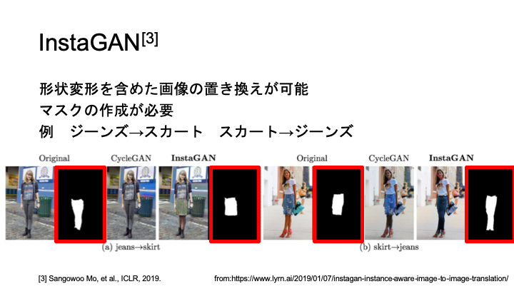 そこで,これらCycleGANの欠点を改良したモデルがないか調査した所,2019年(最新!)論文でこれらの欠点を克服できるかもしれないモデルを見つけました.その名もInstaGANです.
