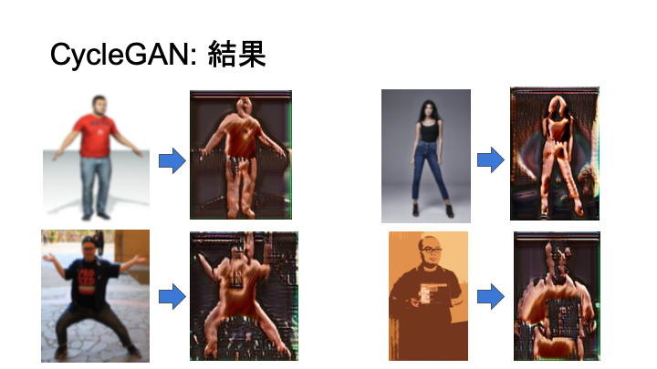 CycleGANとマッチョデータを使った実験結果は,こんな感じになりました.