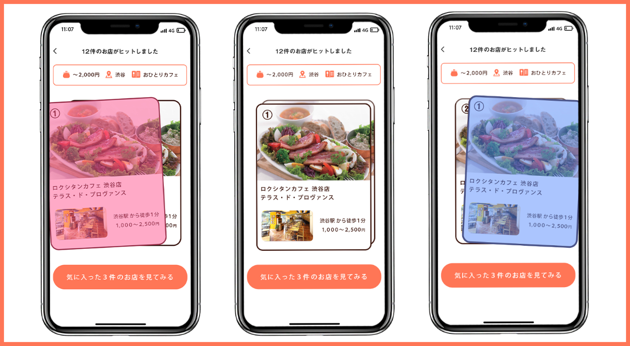 ・「気に入った〇件のお店を見てみる」「〇件のお店がヒットしました」など数字で表記することでゴールを明らかにし、「これいつまで続くんだろう…」とユーザーがモヤモヤしないように工夫した。