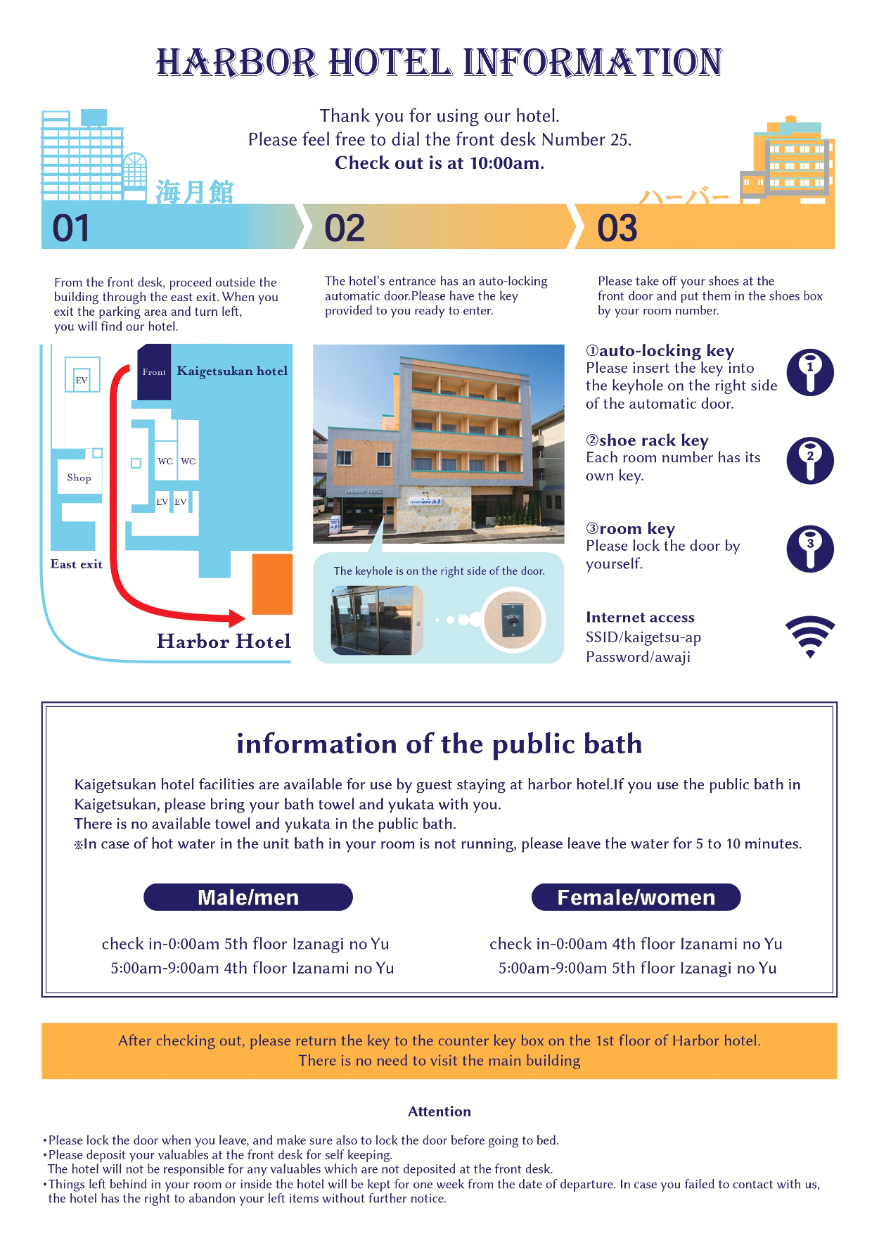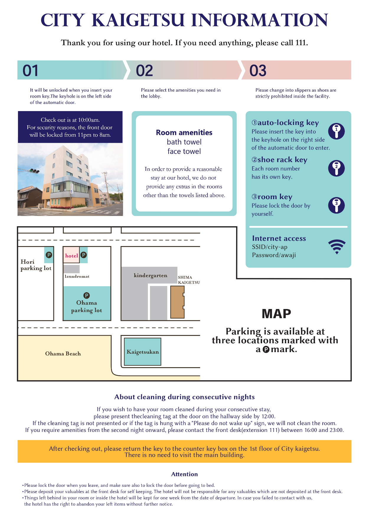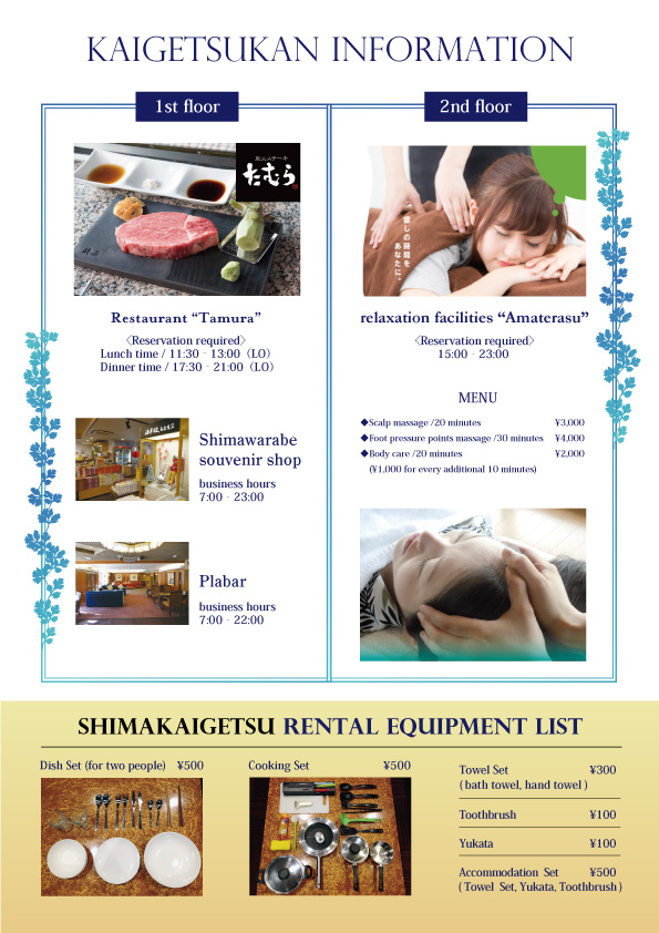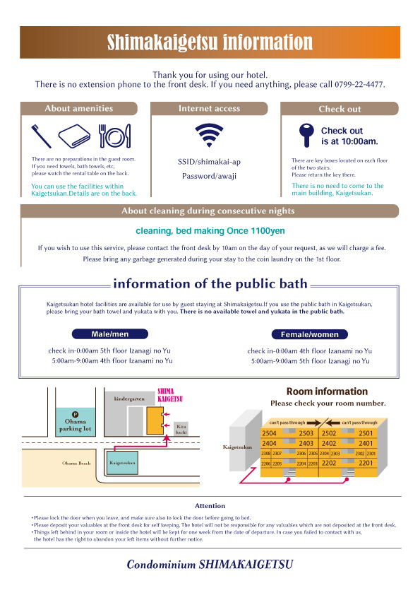 ホテル施設案内 野原 デザイナー OVERVIEW ビジネスホテル施設案内の日本語・英語版を作成。 YEAR 2023 【目的】ビジネスホテル宿泊者様向けに館内サービスの案内を作りました。フロントスタッフが常駐しないため、1枚で概要を確認いただける内容にしました。【取り組み】1施設作成予定でしたが3施設分を担当したいと自ら提案しました。現地スタッフと連携し英文翻訳に対応しました。島海月日本語版はこちらハーバーホテル海月シティ海月館 WEBSITE