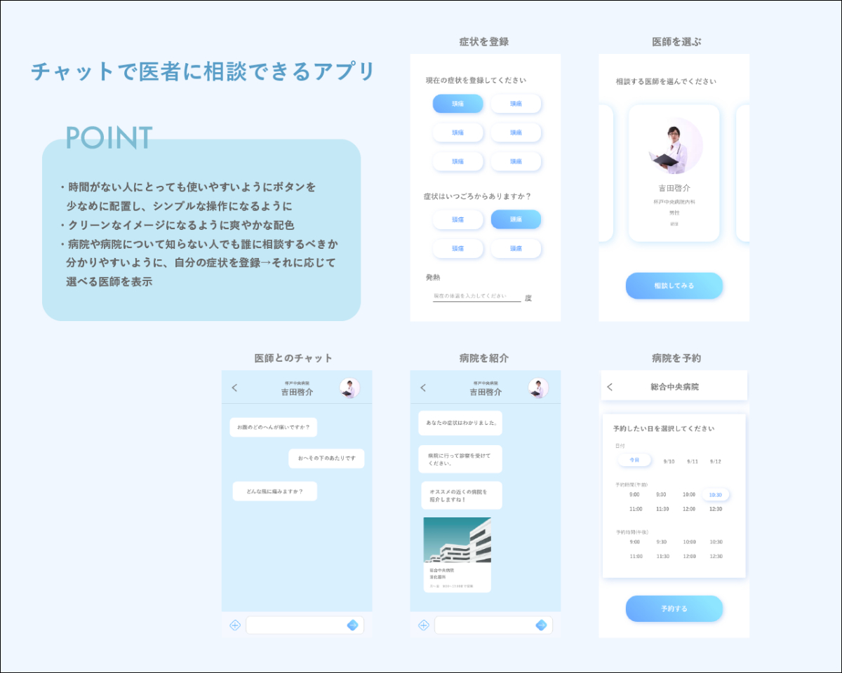 あまり病院に詳しくない人でも簡単にお医者さんが見つかるよう、症状を登録するだけでお医者さんを選んでくれる設計にしました。