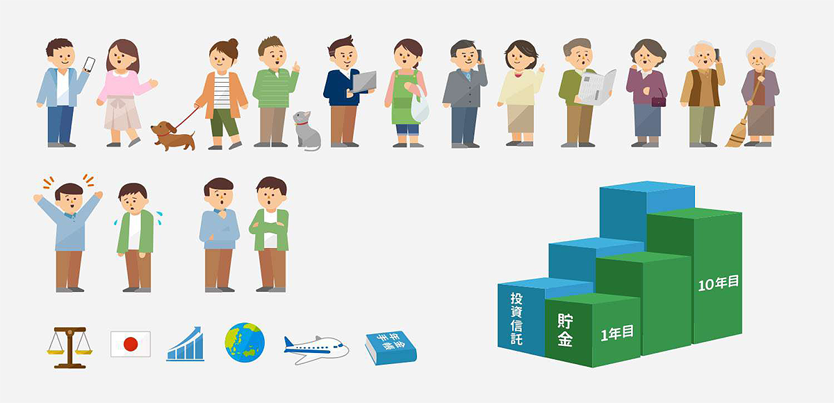 年代別のイラストがわかりやすくするように意識しました。また、グラフがメインなのでなるべくグラフで使用している色より目立たない配所を使用しています。