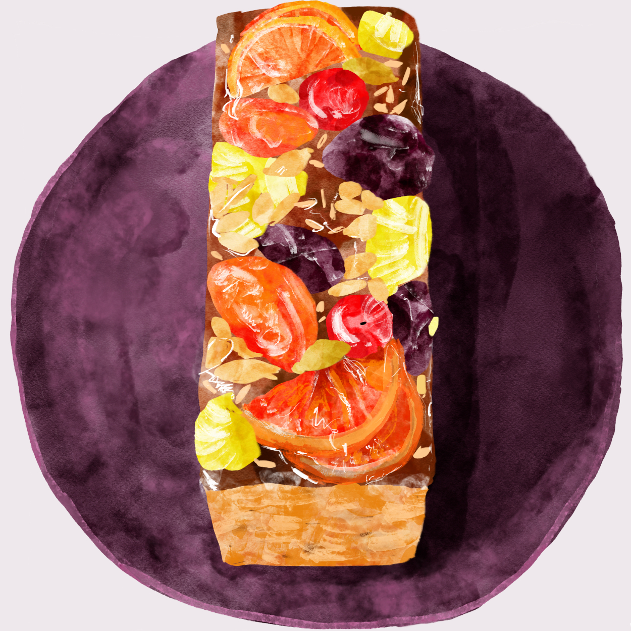 見たことがないくらい、豪華で美味しそうなパウンドケーキを描きました。ドライフルーツやナッツが乗っていて、照りが美味しそうです。お皿もおしゃれな焼き物にしました。