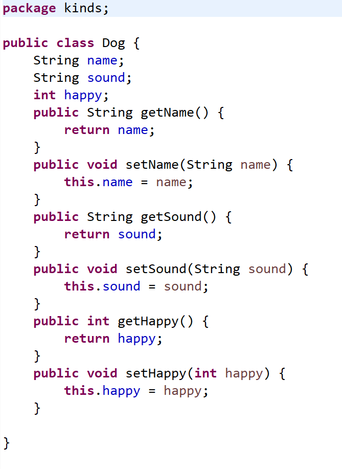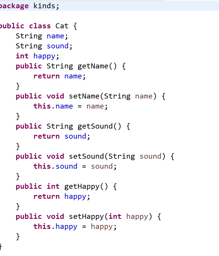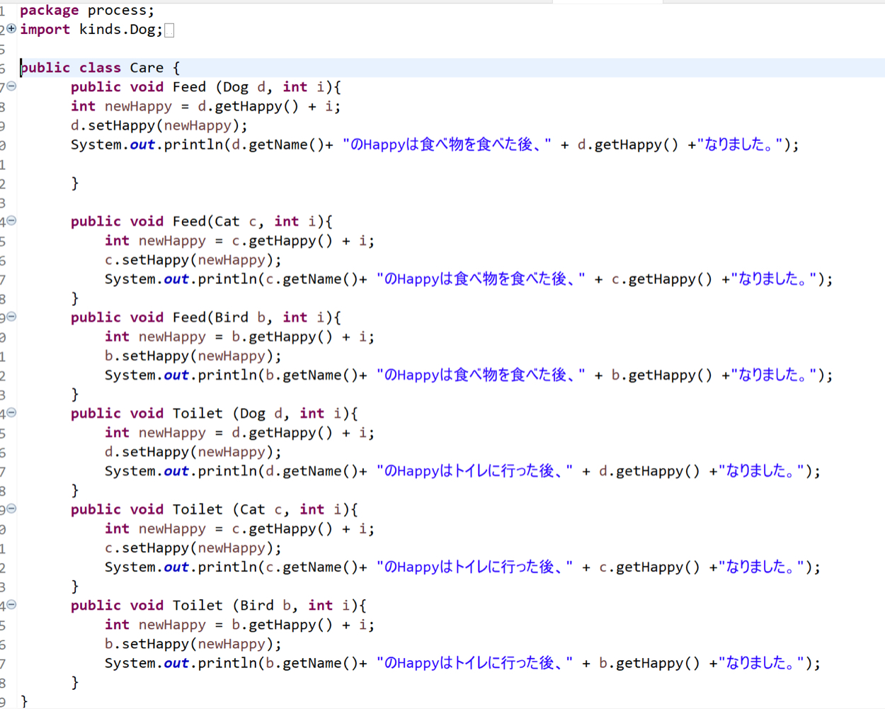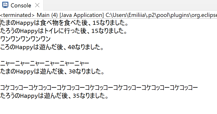 このプログラムには、猫、犬、鳥の 3 匹の動物が登場します。 アクションの対象となる動物に応じて、コンソールに表示される言葉が異なります