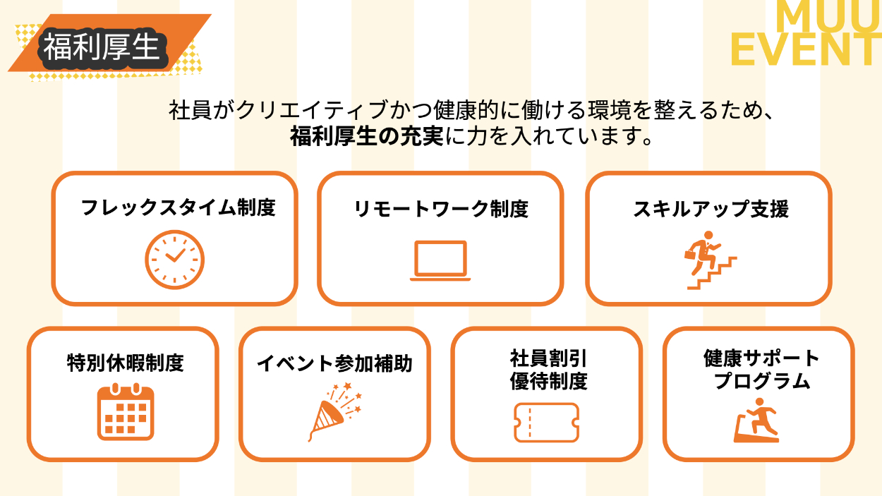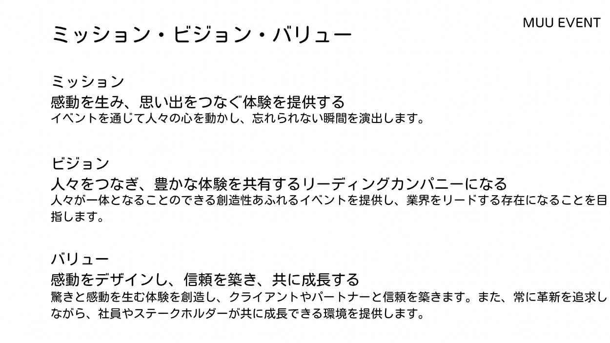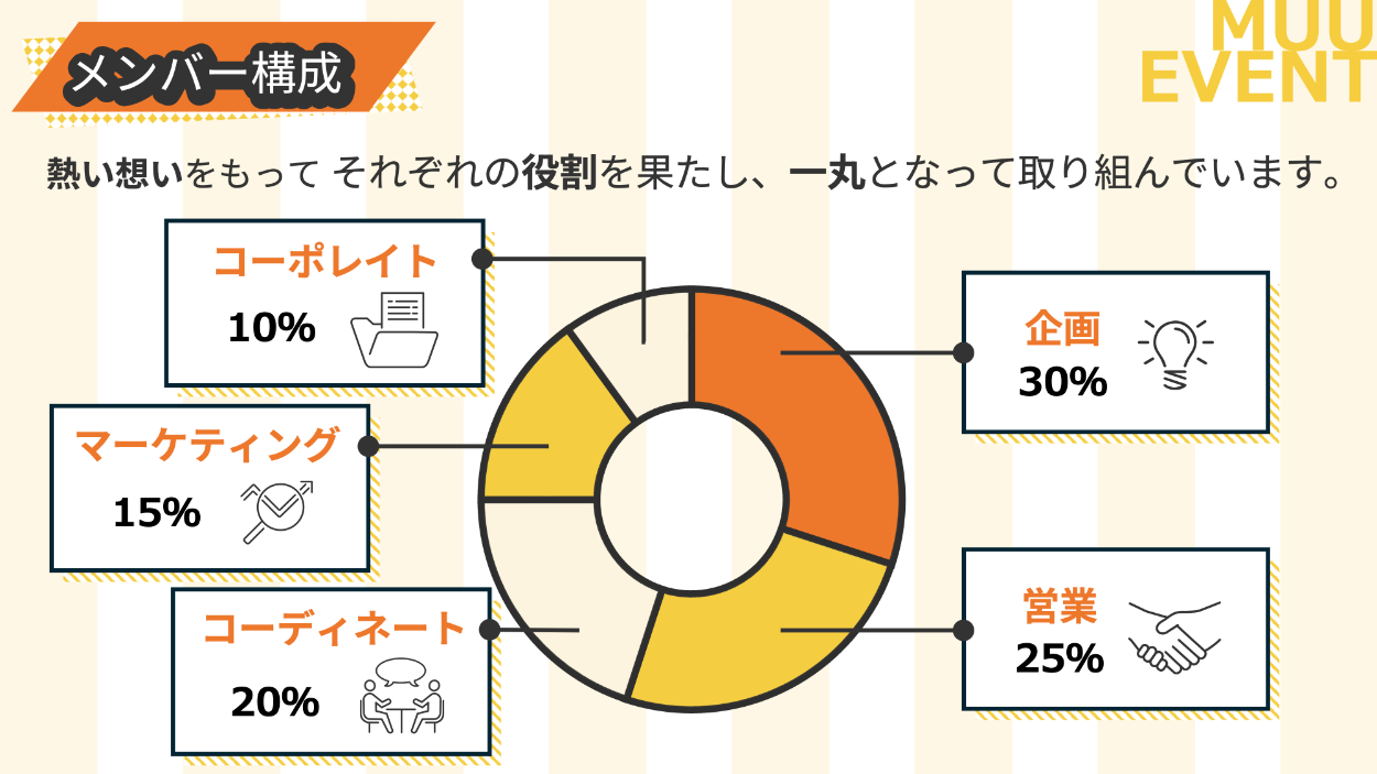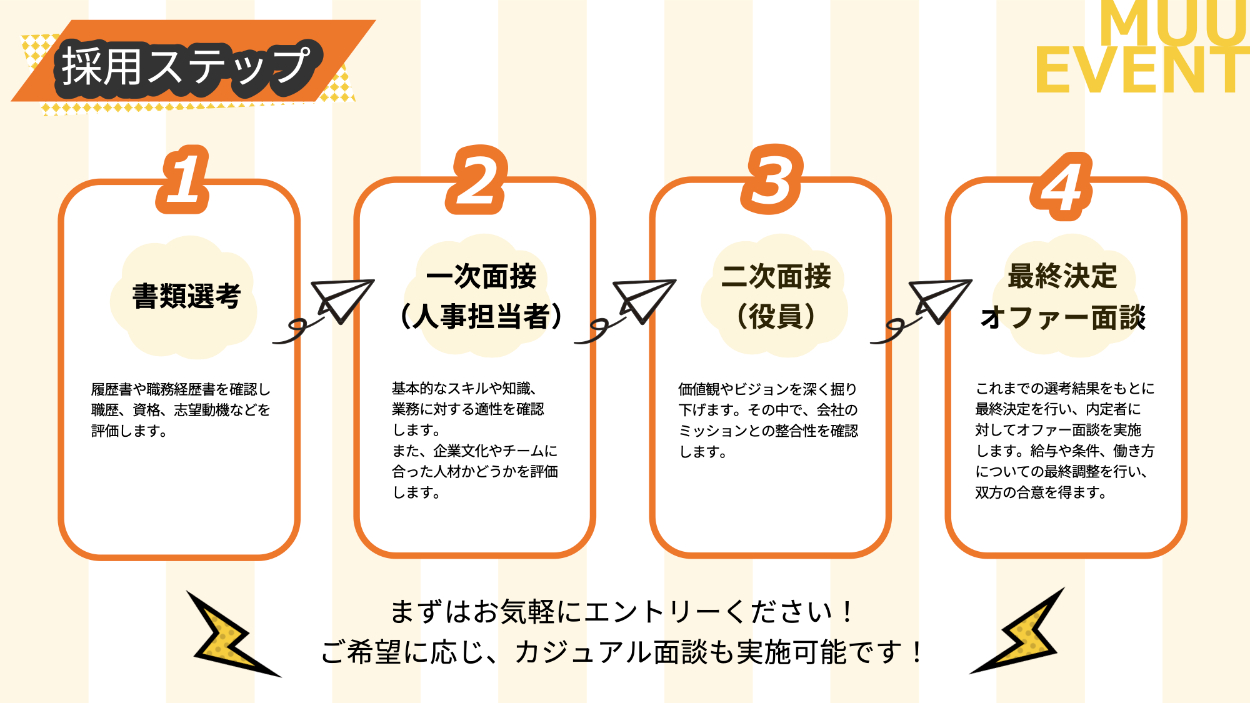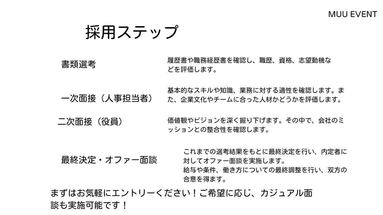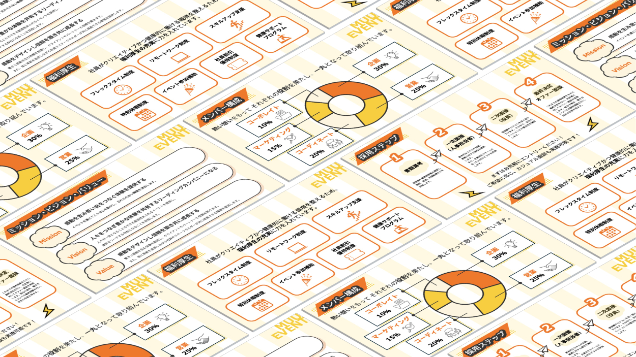 資料デザインコミュニティMUUTOWNの課題として、架空のイベント企画会社の採用資料制作に取り組みました。【制作期間:8時間/使用ツール:PowerPoint・Illustrator】