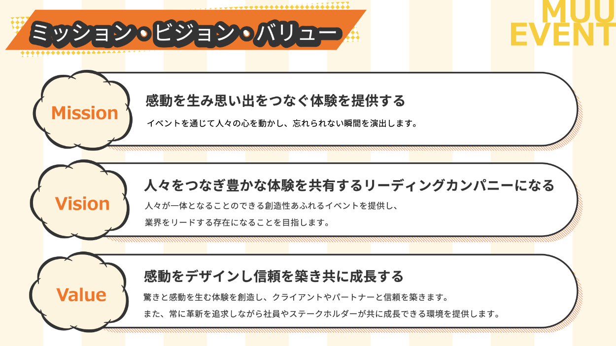 【1/4】ワクワク感=膨らむ期待=イベント会社ならではの発想力=雲のイラストでMVVを表現。ここで雲のイラストがポップコーンにも見えるかもしれないことを含ませることで、ゆったり映画を観るように、楽しい雰囲気で説明が聞けるように意図しました。