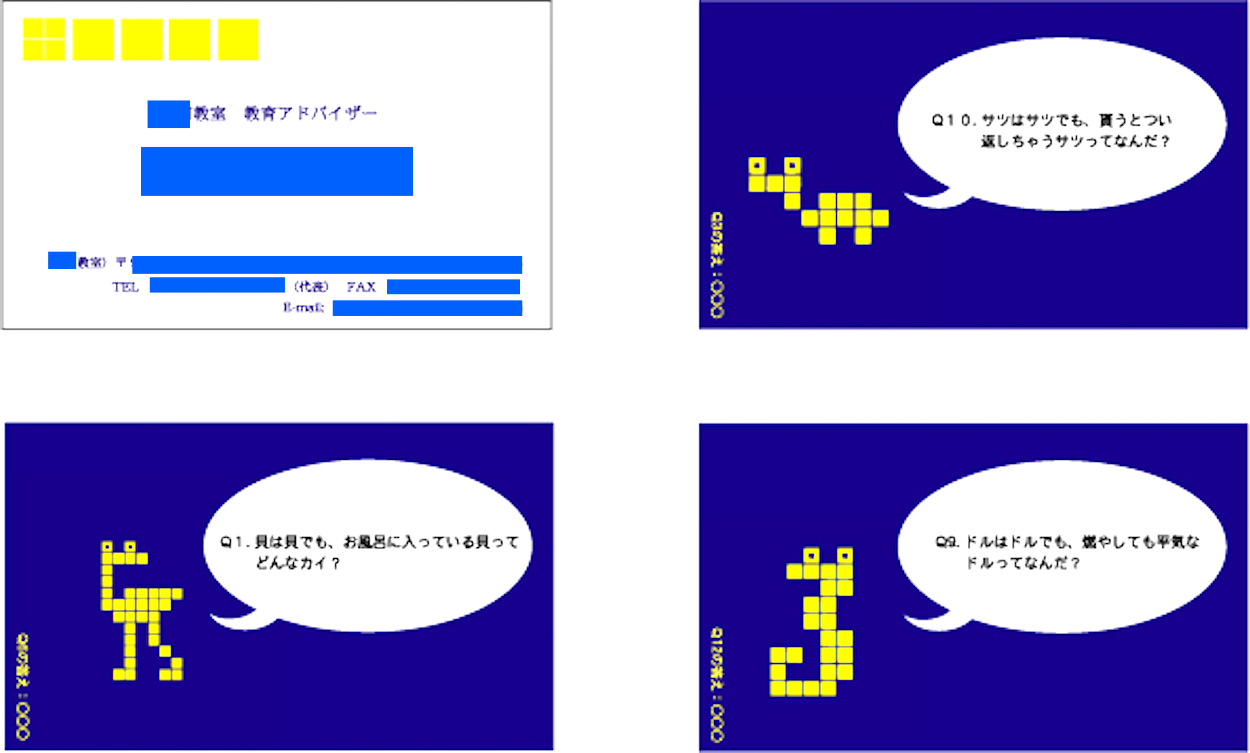 主に生徒に向けて考案されました。講師の持つ名刺の裏面には公式キャラクター、クイズの問題、別の問題の答えが記載されており、講師の人数分のパターンがあります。生徒にとって講習会は通常の授業で教わる講師以外が担当になる機会も多いため、初対面の講師から渡される名刺を集めていくと、色んなバリエーションの名刺を集める事が出来、クイズの答え合わせにも繋がるという物です。