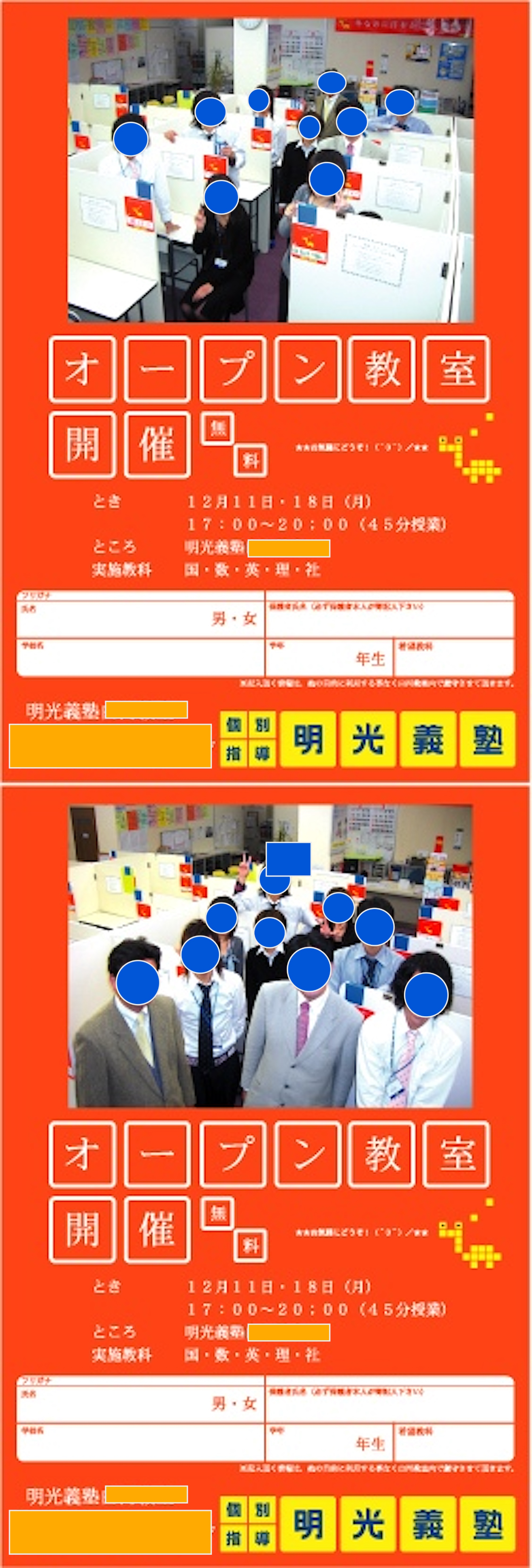 ◆コンセプト / オープン教室の開催時期が冬期講習前だった事もあり、冬期講習会のテーマカラーと同じオレンジをメインカラーに使う事で統一感を計りました。イラストや明光義塾のロゴは公式の規格に準じた物を使用しています。