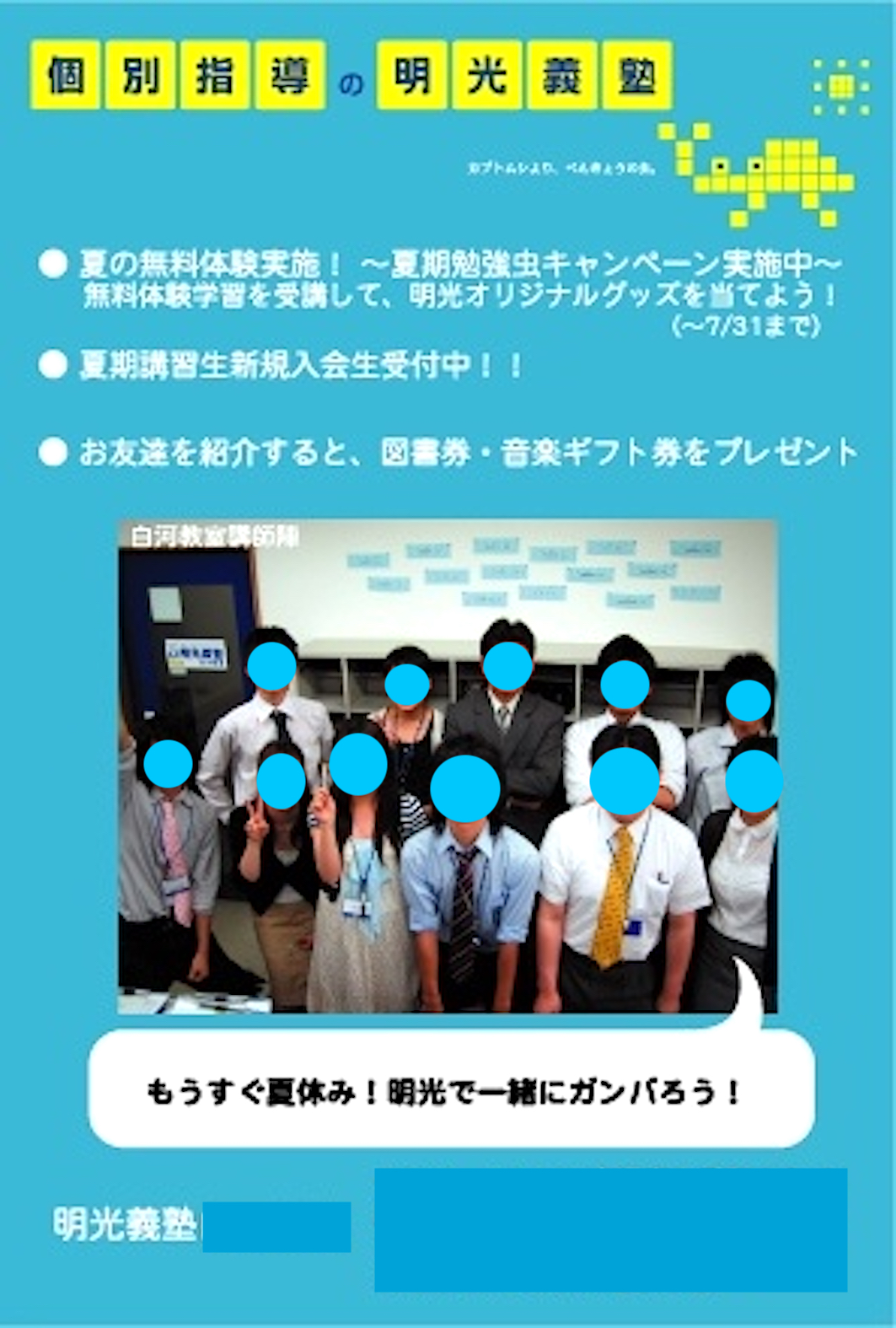 ◆コンセプト / 明光ネットワーク本部で制作された教室用販促物・掲示物等があり、季節ごとの講習会のテーマカラーが設定されていました。夏期講習会は明るめのスカイブルーになっており、夏の無料体験は夏期講習会より前の期間に行われる事から、同じスカイブルーを使用して関連性を持たせました。イラストや明光義塾のロゴは公式の規格に準じた物を使用しています。