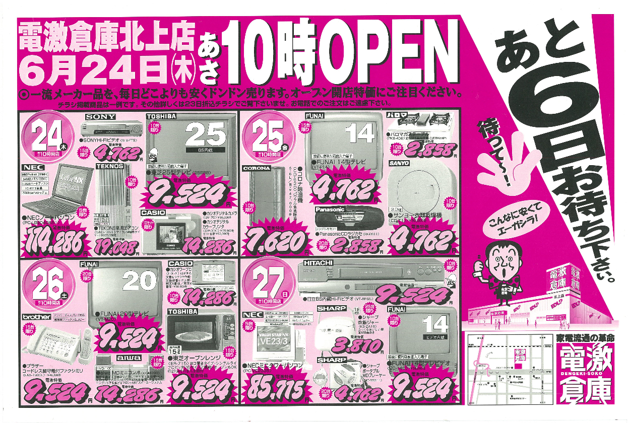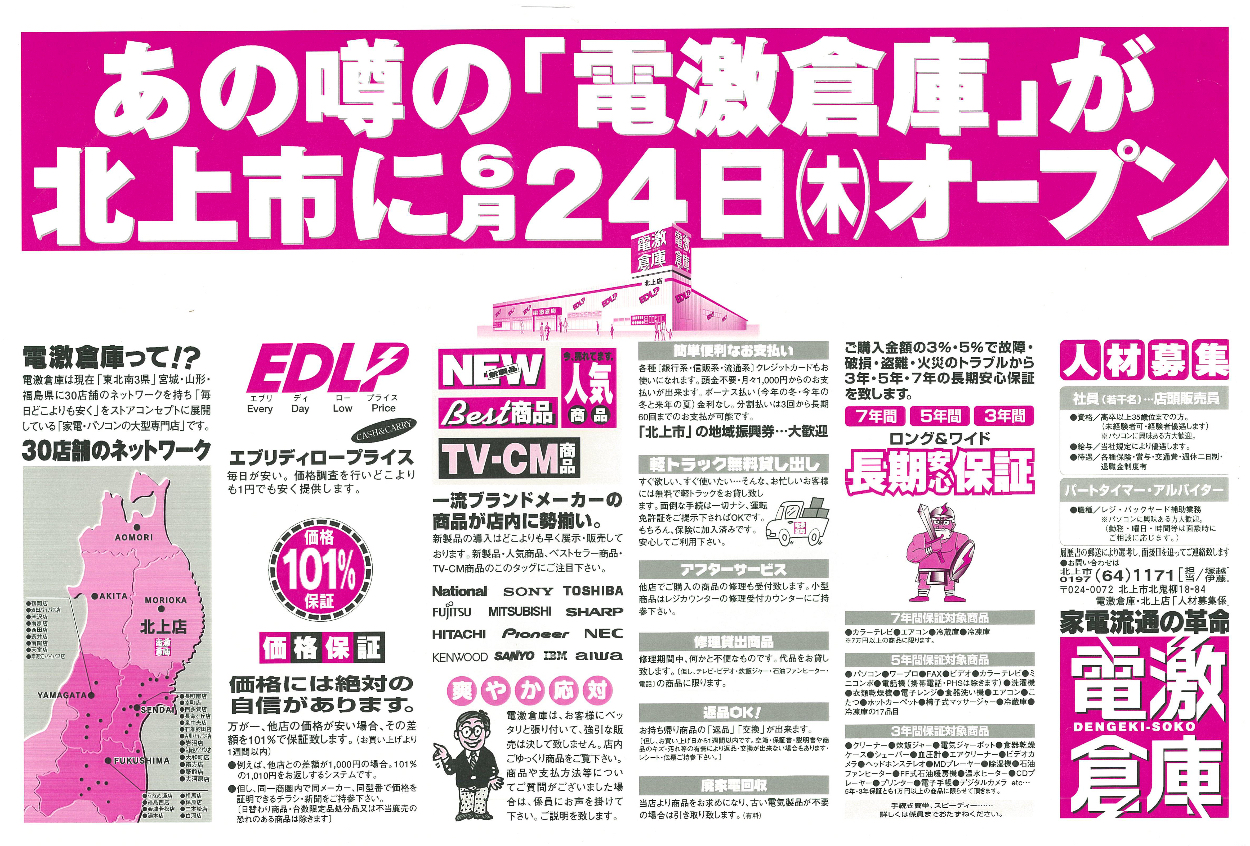 1998年くらいの制作物です。デジタルに移行してから1年くらいだと思います。仙台の量販店である「庄司デンキ」からリニューアルし「電撃倉庫」として生まれ変わった時です。オープン当初から私が手がけておりました。