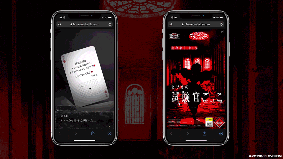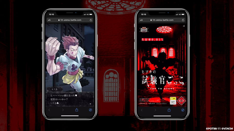 『HUNTER×HUNTER アリーナバトル』の事前登録キャンペーン「ヒソカの試験官ごっこ」 の画面制作を一部お手伝いいたしました。