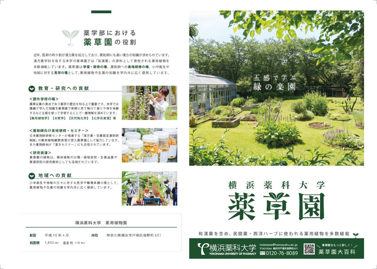 【パンフレット】薬草園パンフレット in'k デザインや書きものしてます <ツール>・パンフレット(A5二つ折り)<内容>大学内「薬草園」の紹介用パンフレット。地域イベントや高校にも配布することを考慮し、老若男女に対するわかりやすさを意識しました。<パンフレット> WEBSITE