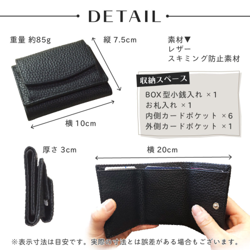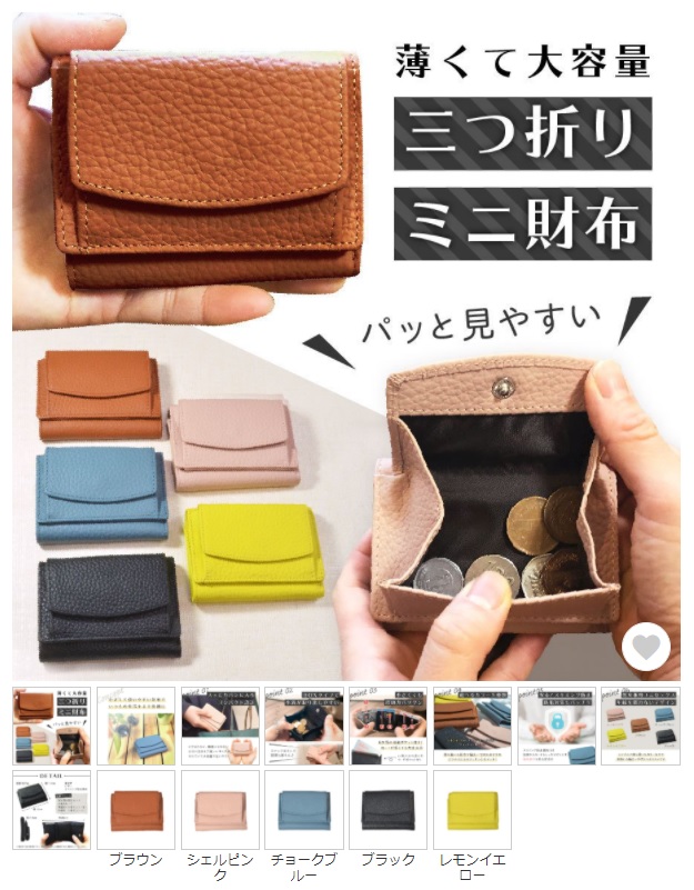 ≪1枚目≫ サムネイルにもなるので、商品のポイントを遠目でも分かるようにデザインしました。商品のサイズ感、容量が大きいこと、大きく開く小銭入れなど。