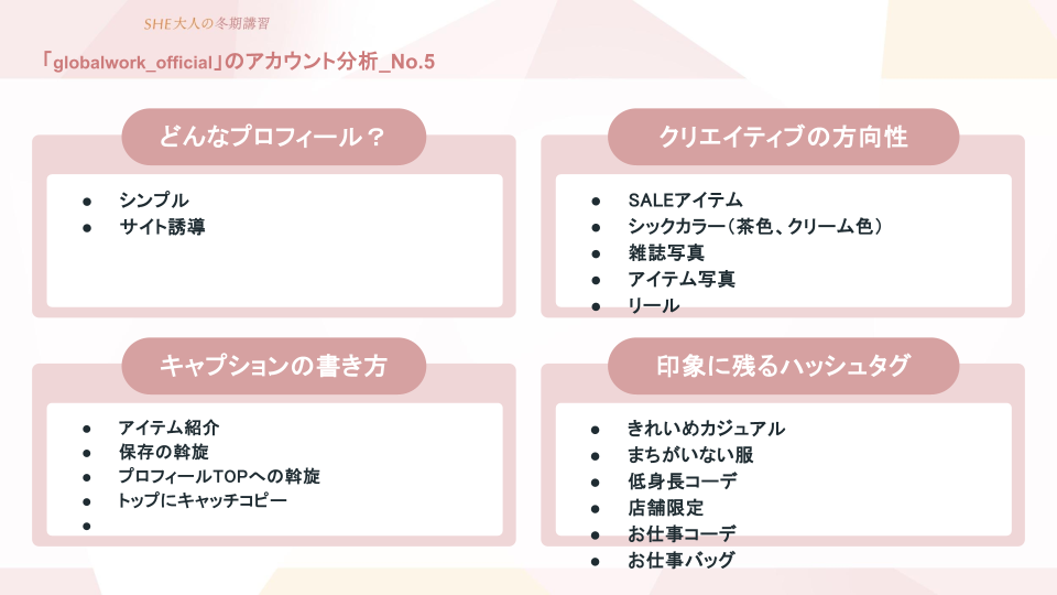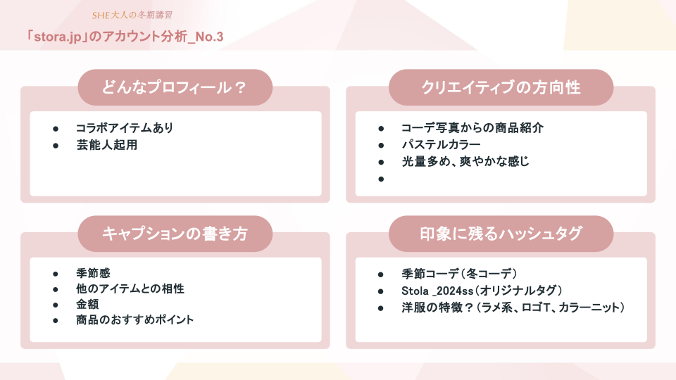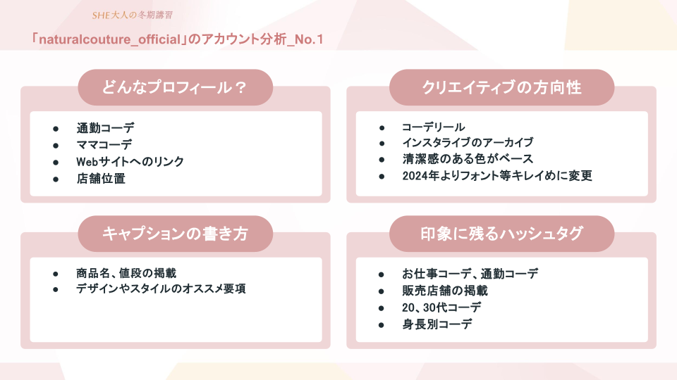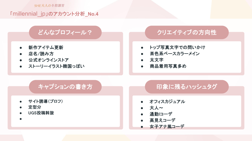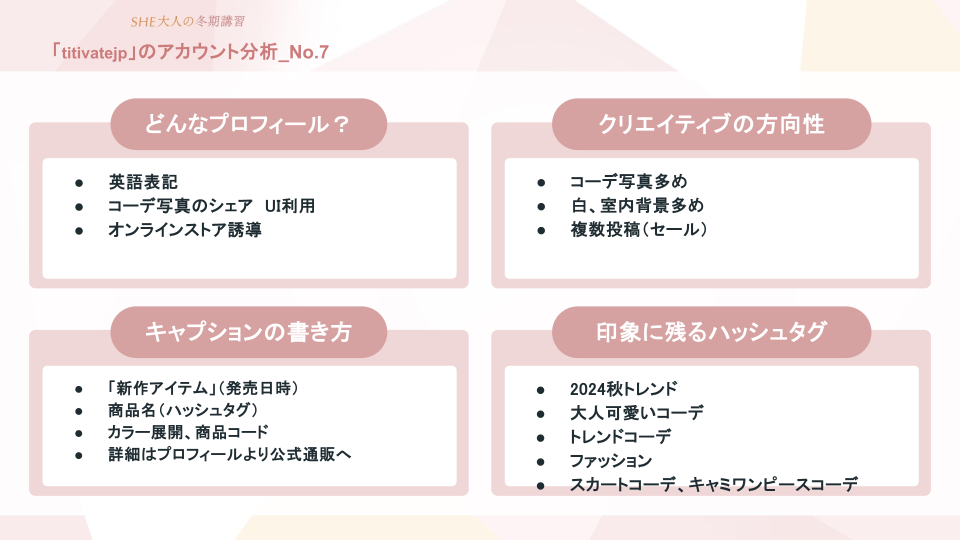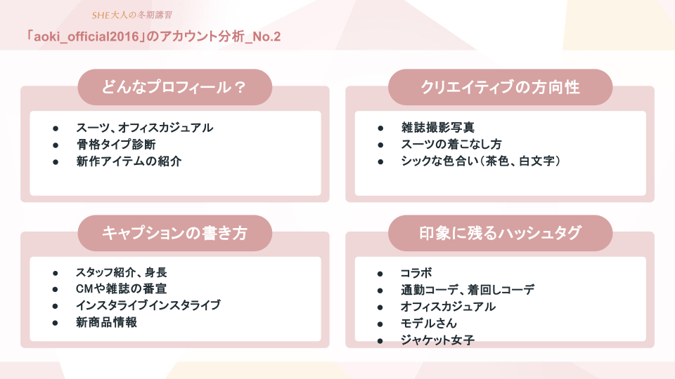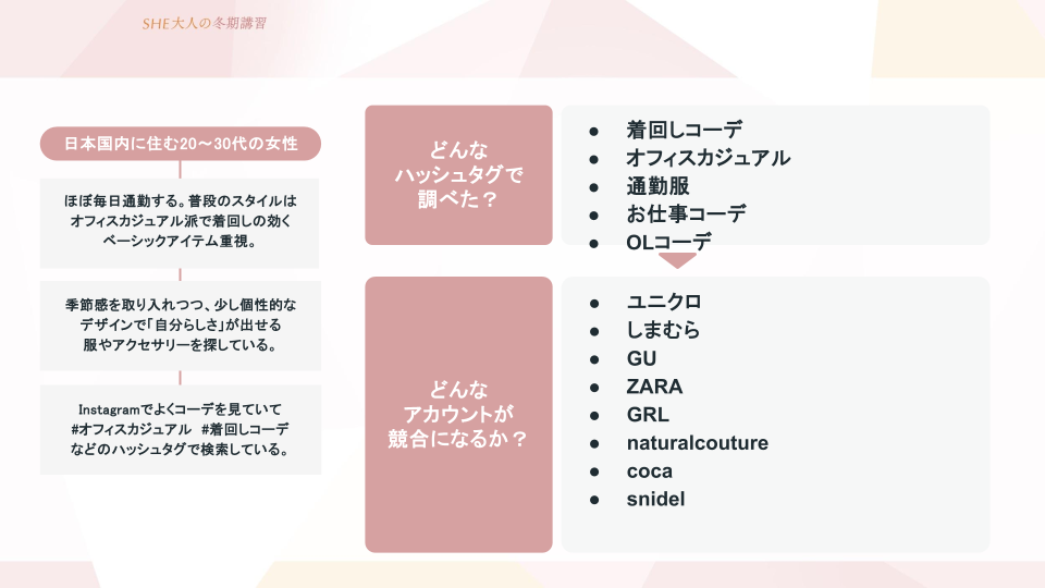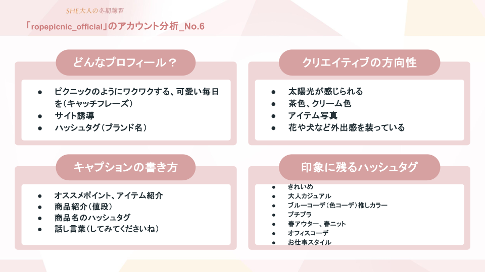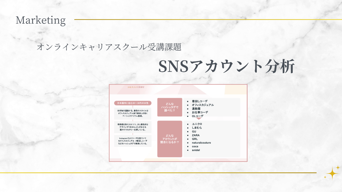 【マーケティング】 にゃんちゅう 思いやりの心で、 確かな成果を生み出す マルチクリエーター OVERVIEW キャリアスクールのマーケティングコースで実施したSNSアカウント分析です。 上記のシーアバンライフという架空のアパレルショップの競合を考え、その実際のSNSアカウントを分析したものです。7つのアパレルショップについてSNS分析してみました。