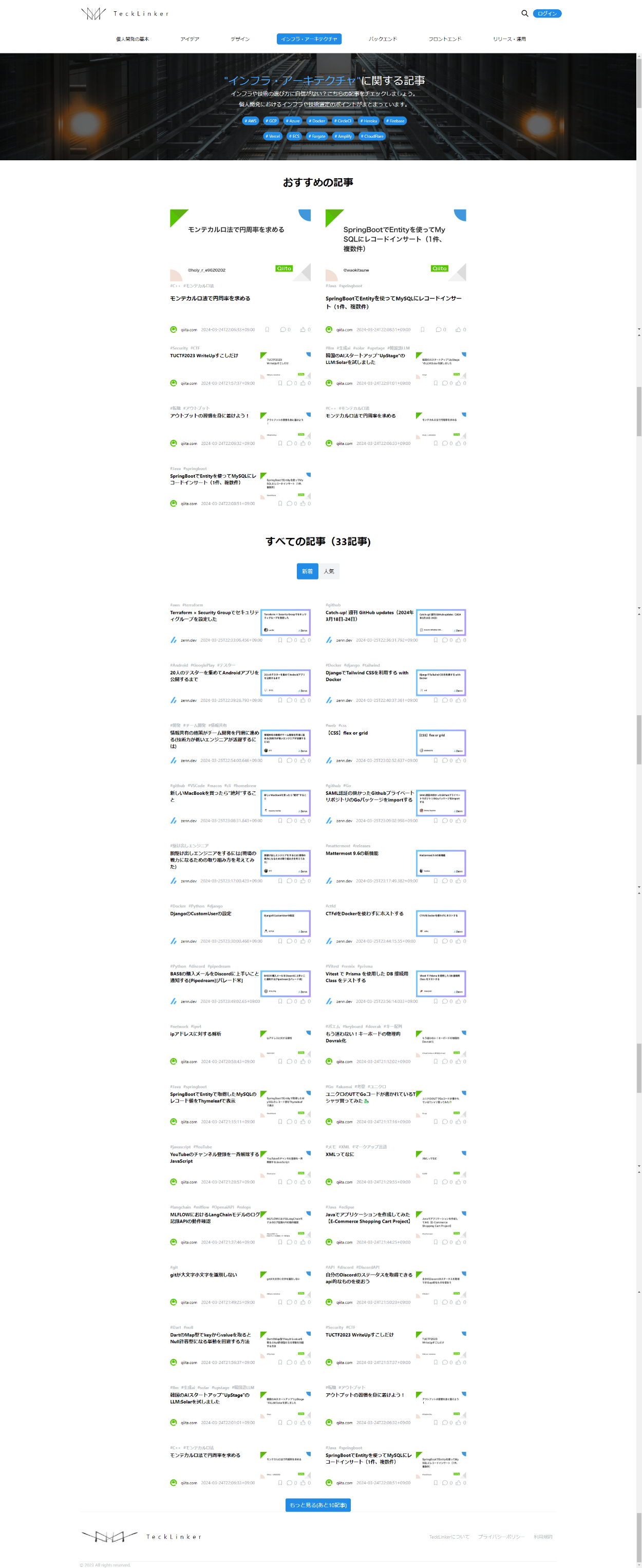 また、"インフラ・アーキテクチャ"に関する記事では、インフラや技術の選び方に自信がないユーザー向けに、個人開発におけるインフラや技術選定のポイントがまとまっています。"バックエンド"に関する記事では、バックエンド開発の基本から高度なテクニックまで、様々なポイントがまとまっています。