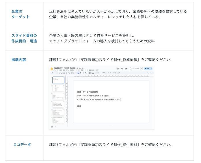 SHElikes PROデザイナーコース7つ目の実践課題。架空クライアントからの依頼や提供データを元にビジネスシーンで使用するスライド資料を作成しました。