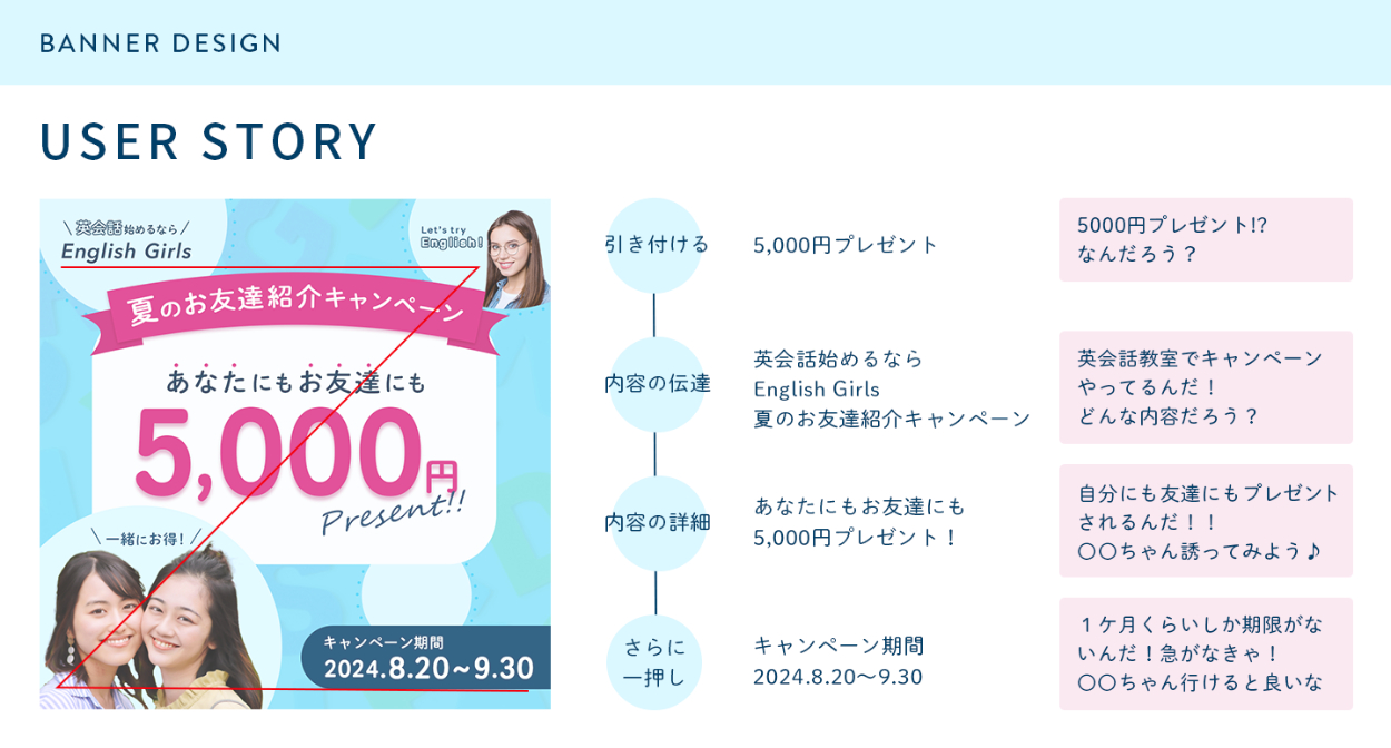 英会話や外国に興味があるけど一人だと通うのに不安がある人に向けたレイアウトにしようと考えました。友達と一緒にお得にキャンペーンが受けられることを伝えられたらと思い、『あなたにもお友達にも』を強調して内容の詳細を伝え、友達をイメージしやすいように写真を近くに配置しました。