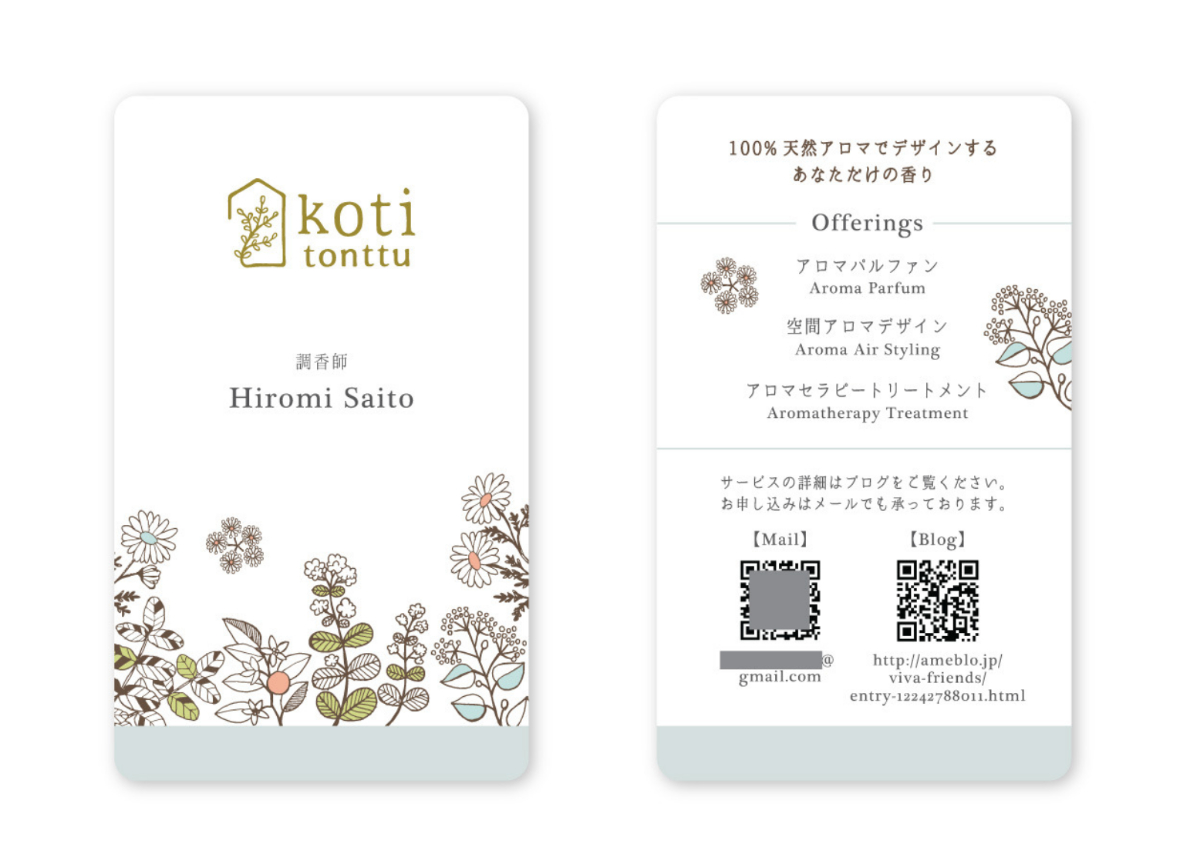 名刺 テリコ グラフィックデザイナー OVERVIEW 第一印象を左右する名刺は、パッと見でその方のイメージが掴めるようなデザインを心がけています。二つ折りタイプや、特殊印刷なども対応可能ですのでご相談ください。