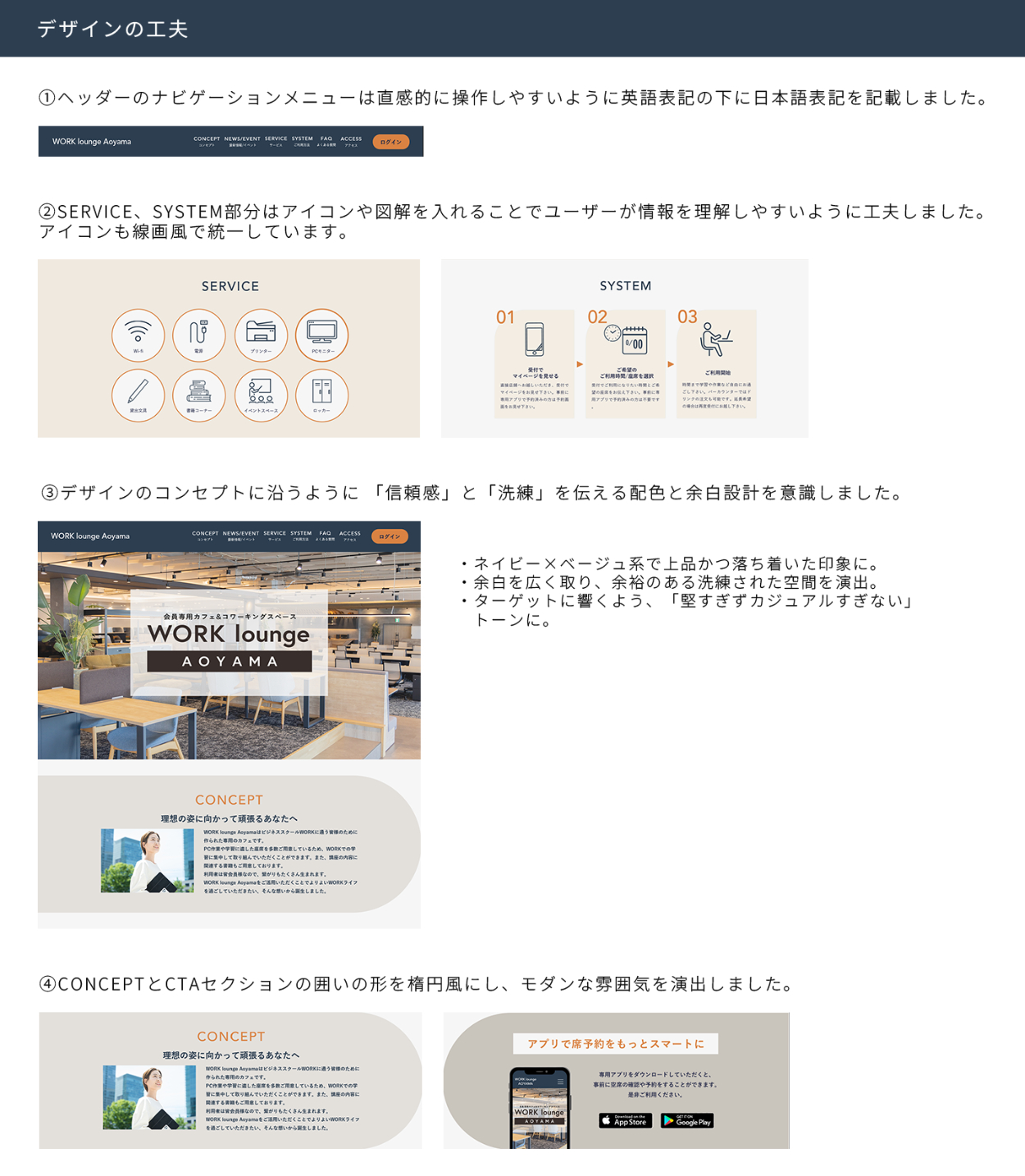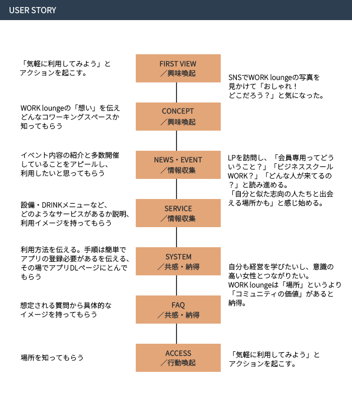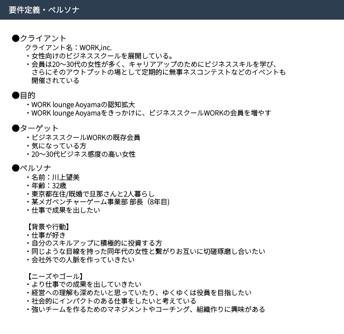 クライアントからのヒアリングをもとに、「WORK lounge AOYAMAの認知拡大」および「ビジネススクールWORKの会員増加」という目的を達成するために、ペルソナの価値観やライフスタイルを深く掘り下げ、キーワードとして「成長 × 落ち着き × 洗練された空間」を導き出しました。この要素を体現する世界観として「北欧モダン」をコンセプトに設定しました。また、単なる作業する場所ではなく、同じ志を持つ仲間と出会える「コミュニティとしての価値」をデザインにも落とし込み、一歩踏み出すきっかけを得られる場としての魅力を伝えられるよう構成しました。