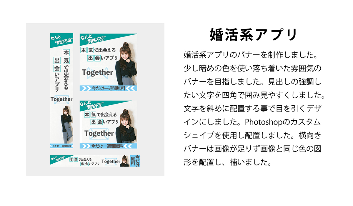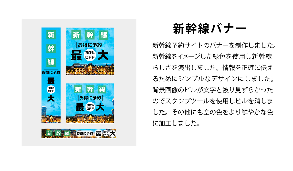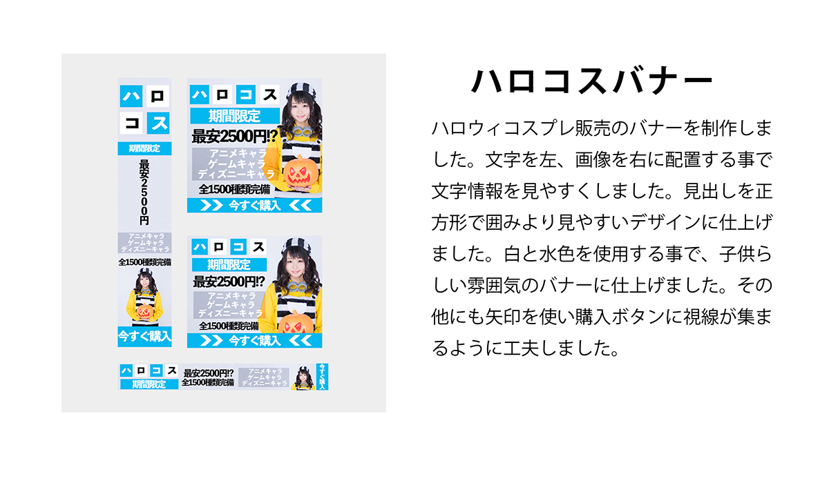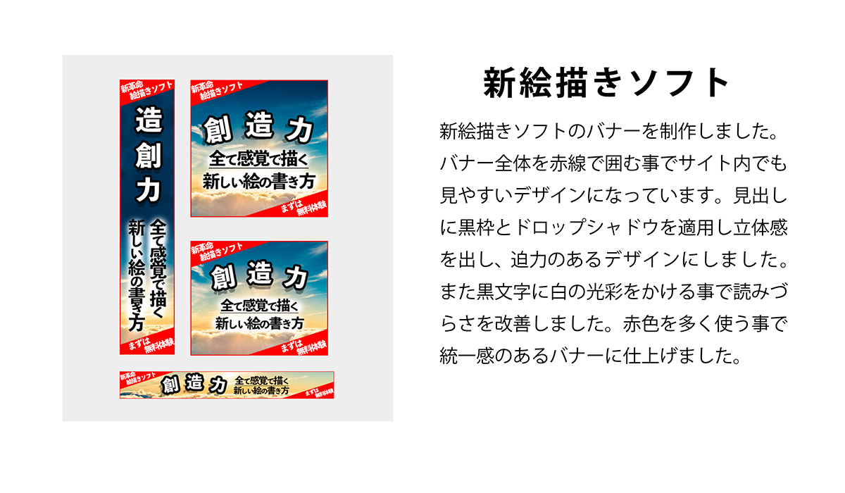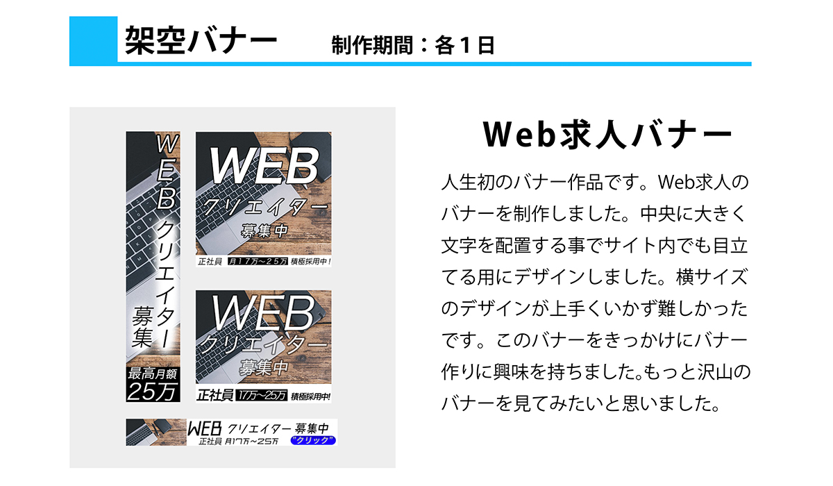 当時バナー デザインが苦手な私は毎日バナーを作れば上達するかと思いスパルタチャレンジ「毎日バナー 作成」を行いました。そんなバナー チャレンジで作成した架空バナー を投稿します。