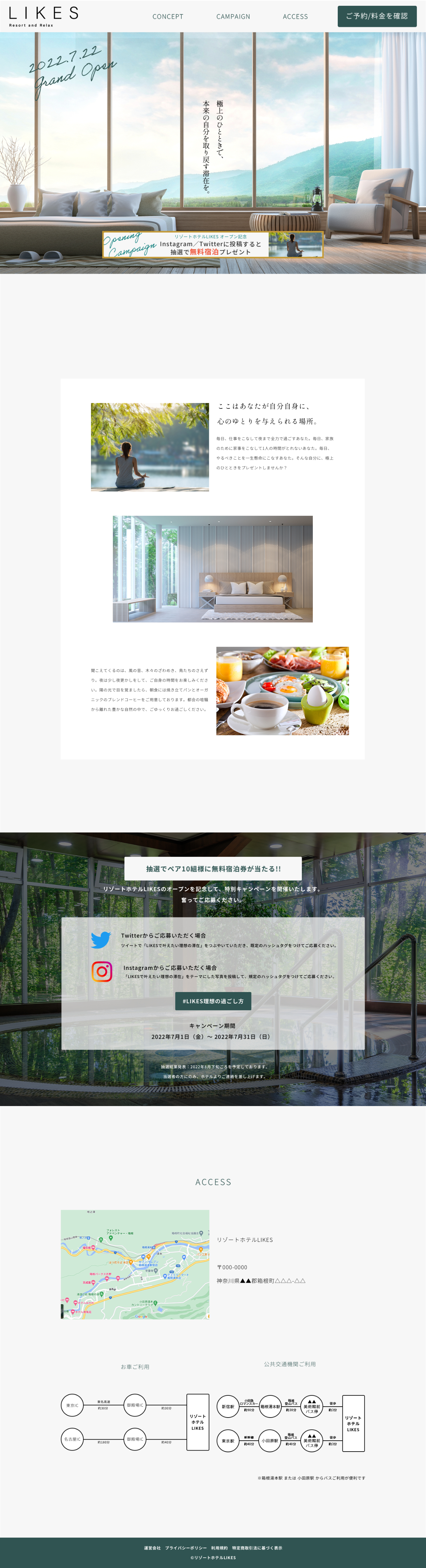 SHElikesの演習型コンテンツ【SHEデザインドリル】のLP制作です。 新規オープンする架空のリゾートホテルのキャンペーンサイトを制作しました。[制作期間:1ヶ月/使用ツール:デザインカンプ→Photoshop・コーディング→HTML/CSS/JQuery (ATOM) ]