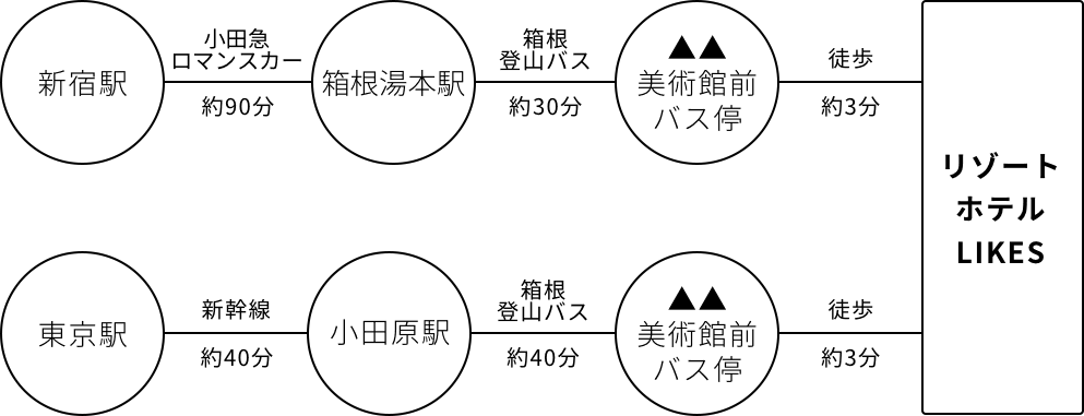 東京駅 >(新幹線)> 小田原駅(約40分)> 箱根登山バス(約40分) > 「▲▲美術館前」バス停> リゾートホテルLIKES(徒歩約3分)