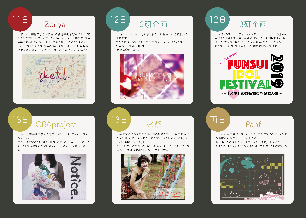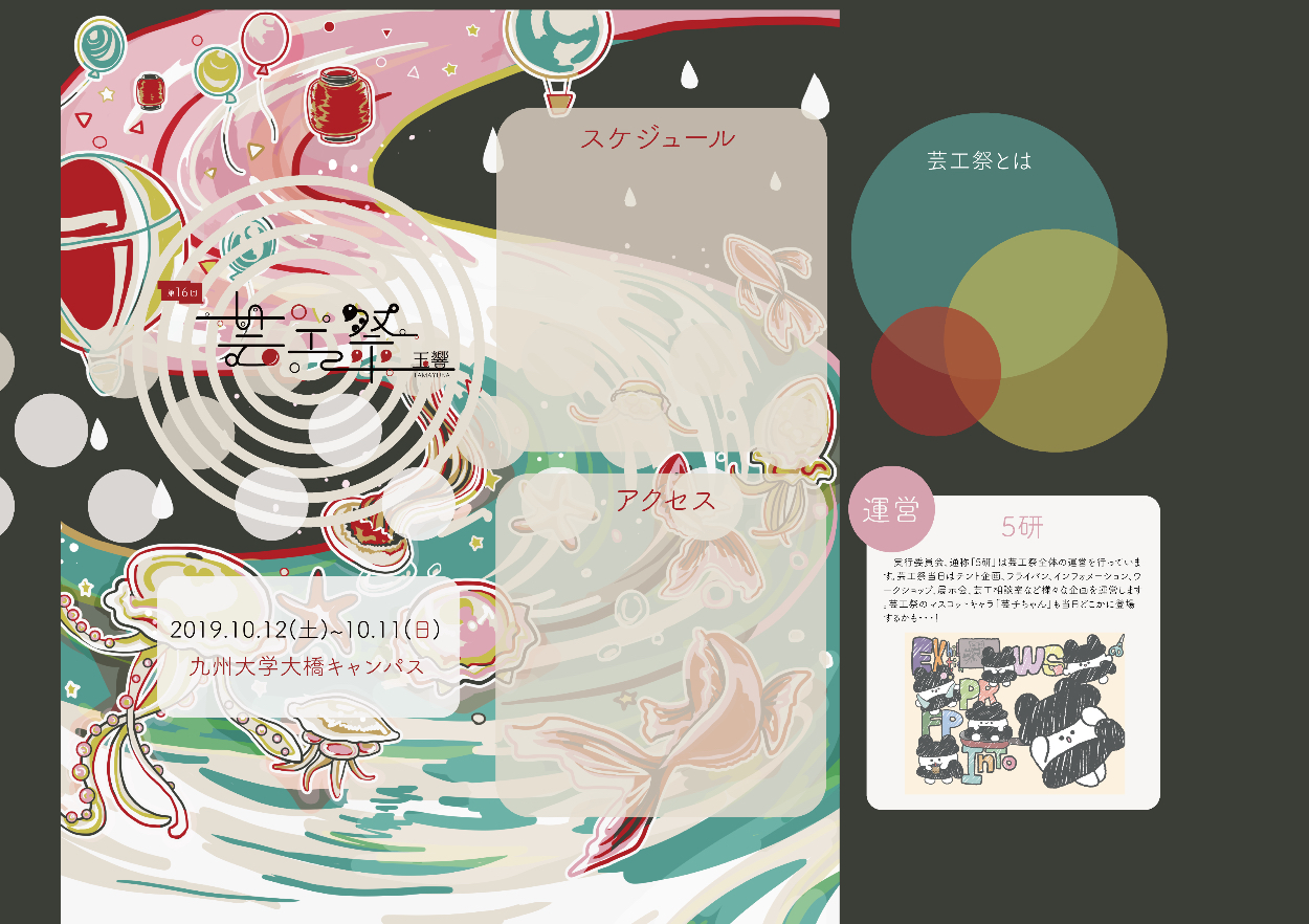 芸工祭19 フライヤー tmtm/MOMOKA NAGATOMI 学生 OVERVIEW 九州大学芸術工学部 芸工祭の2019年度のフライヤーです。 YEAR 2019 2019年度のテーマ「玉響」に即して、和風のイメージ、玉、だけに円を多く用いたデザインにしました。メインビジュアルイラスト、及び各サークルメインビジュアルは他の方制作です。
