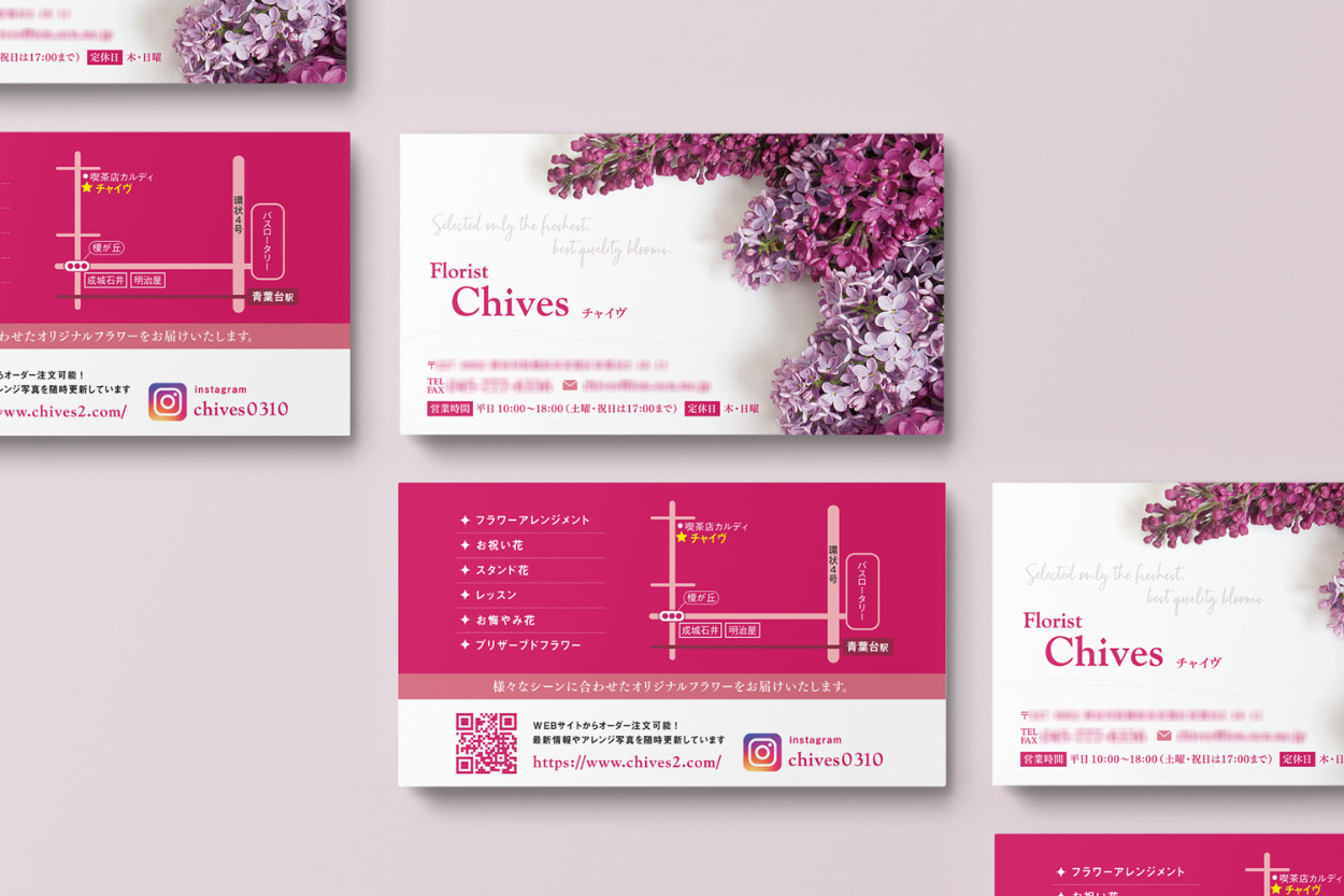 いつもご自身でネットサービスを使ってカードのデザインや印刷を行っていて大変そうでした。Instagramと地図、WEBサイトなどへ誘導できるような構成を提案いたしました。