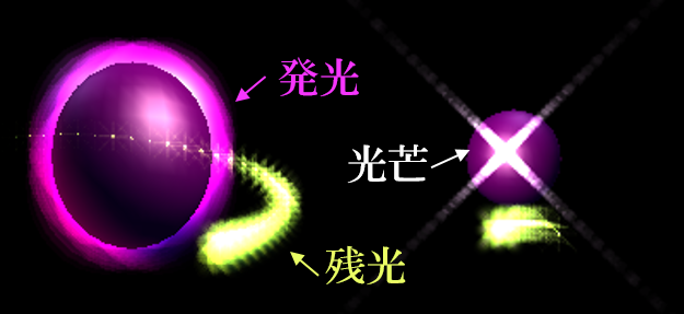 指定された描画命令を発光させる処理も実装しました。同時に発光専用シェーダも作りました。(発光パターンは3種類作ってみました。やっぱ光ってカッコいい…)