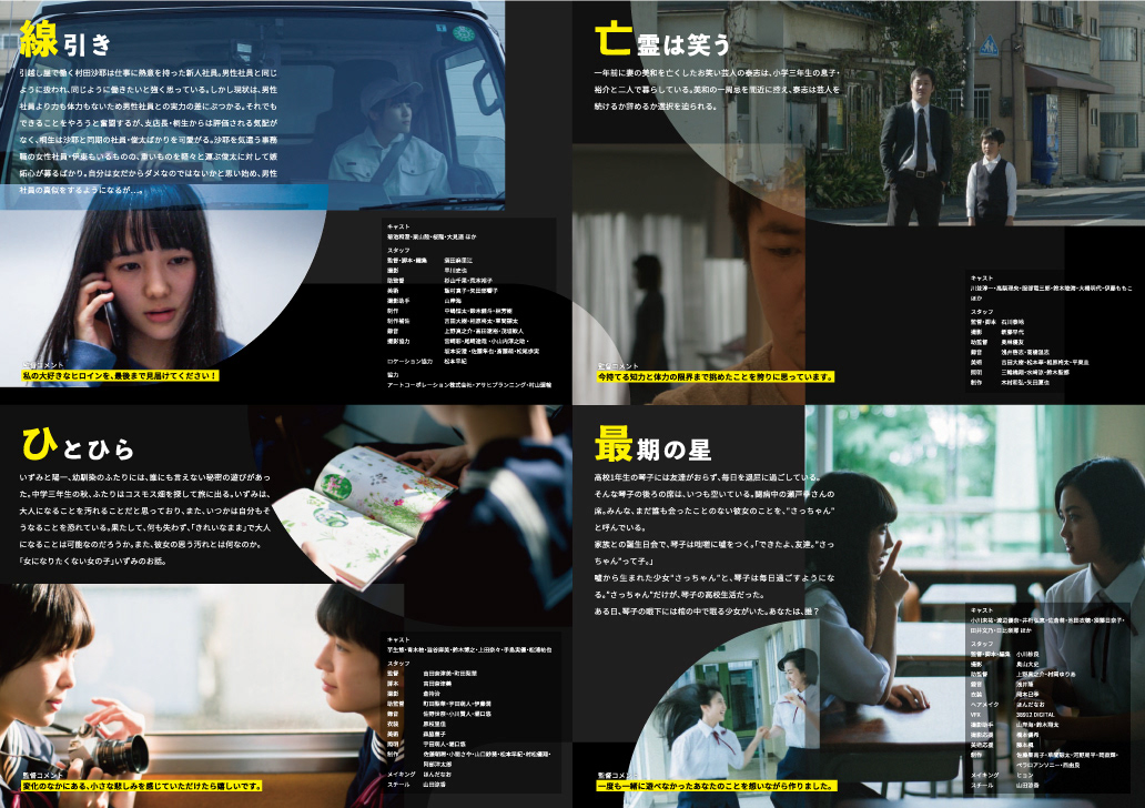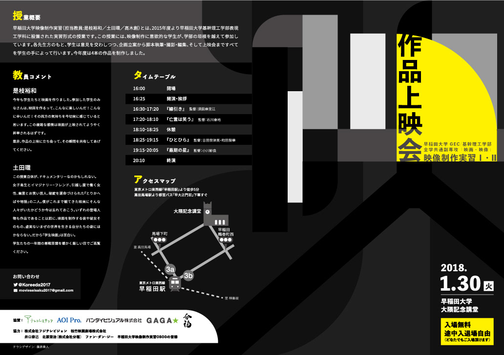 早稲田大学映像製作実習は、カンヌ国際映画祭の最高賞(パルムドール)を受賞した是枝裕和監督をはじめ、経験豊かな講師陣が教鞭を執る、映像製作の授業です。毎年、学生だからこそ撮れる個性豊かな作品が多く生まれています。その上映会のフライヤー制作を担当しました。