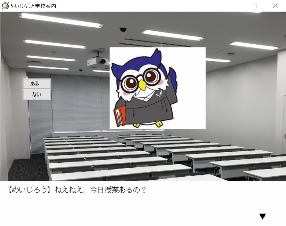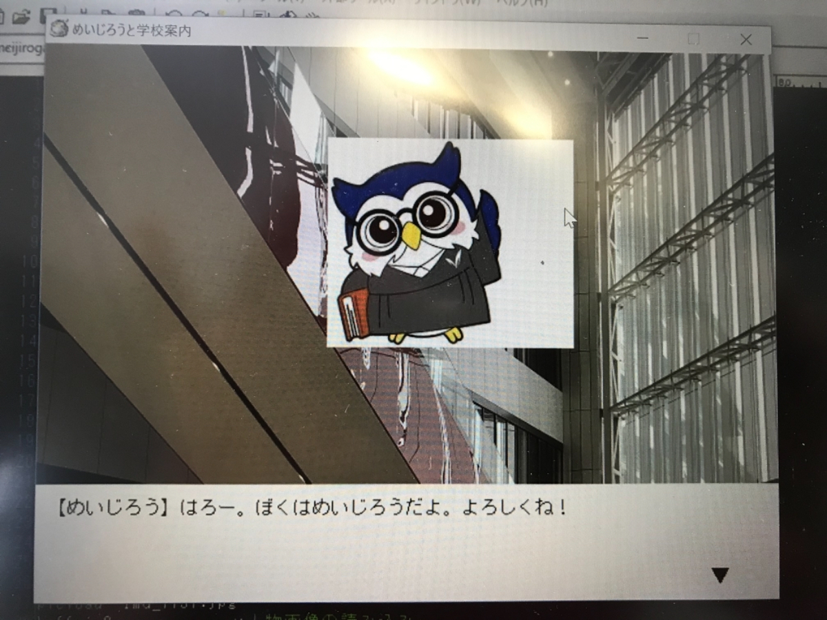 めいじろうと学校案内 Kanako Ogasawara FMS B2 OVERVIEW EP演習(1年春学期)で作った作品 YEAR 2019 EP演習(1年春学期)で作った作品。HSPを使用した。スペースキーを押すと話がどんどん進んでいき、選択肢に応じて話の内容が変わるということをノベルゲーム形式で再現した。背景の画像は全て自分で撮った写真を利用している。2019年5月に作成