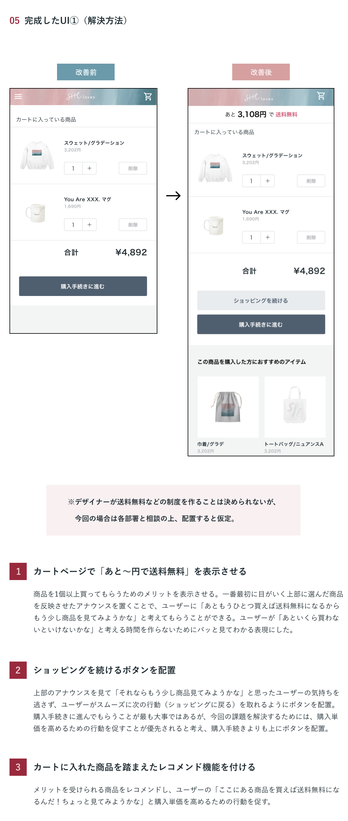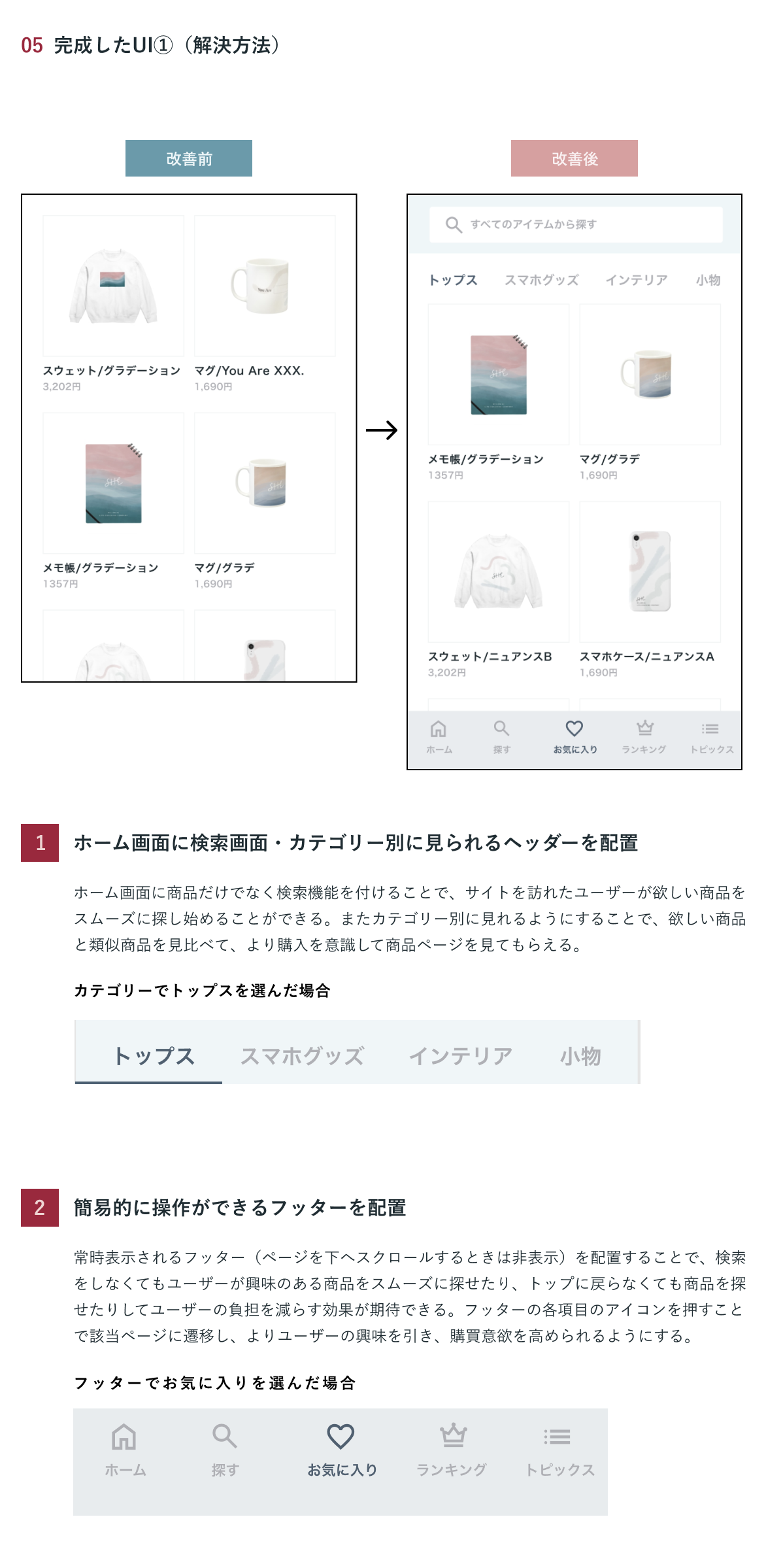 実際にこのページのユーザーになったときに「いかに考える時間を減らして直感的な操作ができるか」を常に意識して取り組みました。情報設計するときは、ただ課題を解決するための方法を考えるのではなく、ユーザーがどんな思考の流れでページを見ていくのかを想像しながらデザインを考えました。ユーザーがサイトを訪れている間、購入に向けたポジティブな気持ちをどうやって保ち続けられるかを考えながら課題に取り組むことができました。
