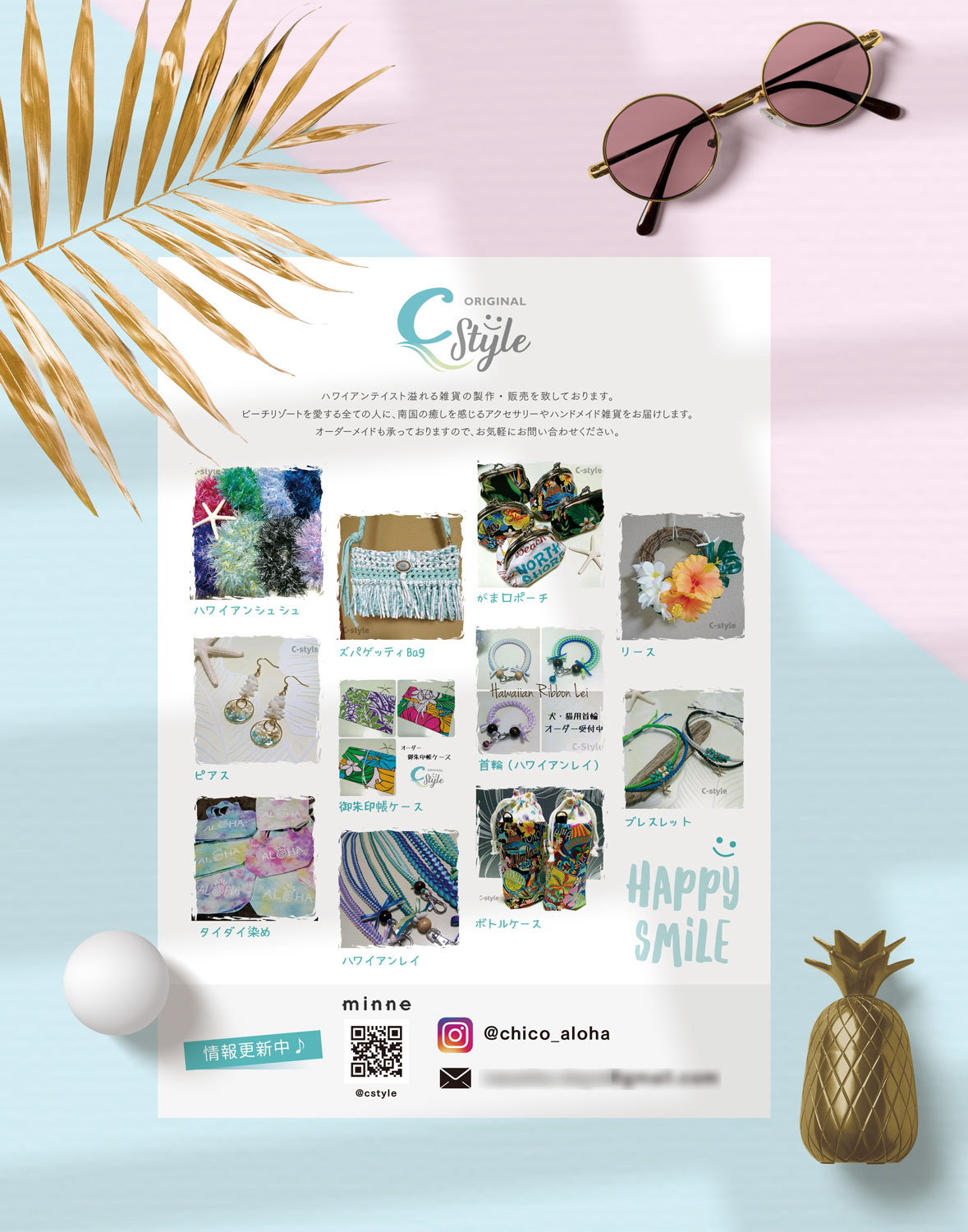 【ご要望】 ハワイアン系のハンドメイドが多いので、ハッピーで明るいイメージのロゴマークを作りたい。Instagramや名刺でも使っていきたいです。