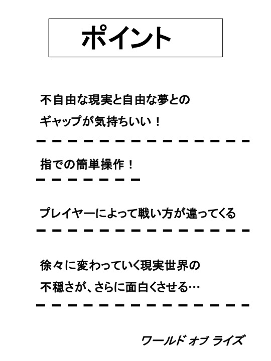 ゲーム企画(課題) 中川 敦子 OVERVIEW オリジナルのゲームを企画する課題。 初めてであったこともあり、苦労することや改善点があった。 YEAR 2022 ○問題点イメージテーマにこだわりすぎたことで、重要である「ゲーム性」が疎かになってしまった。設定した世界観を活かしきれていないように感じる。特質した点を有していない。