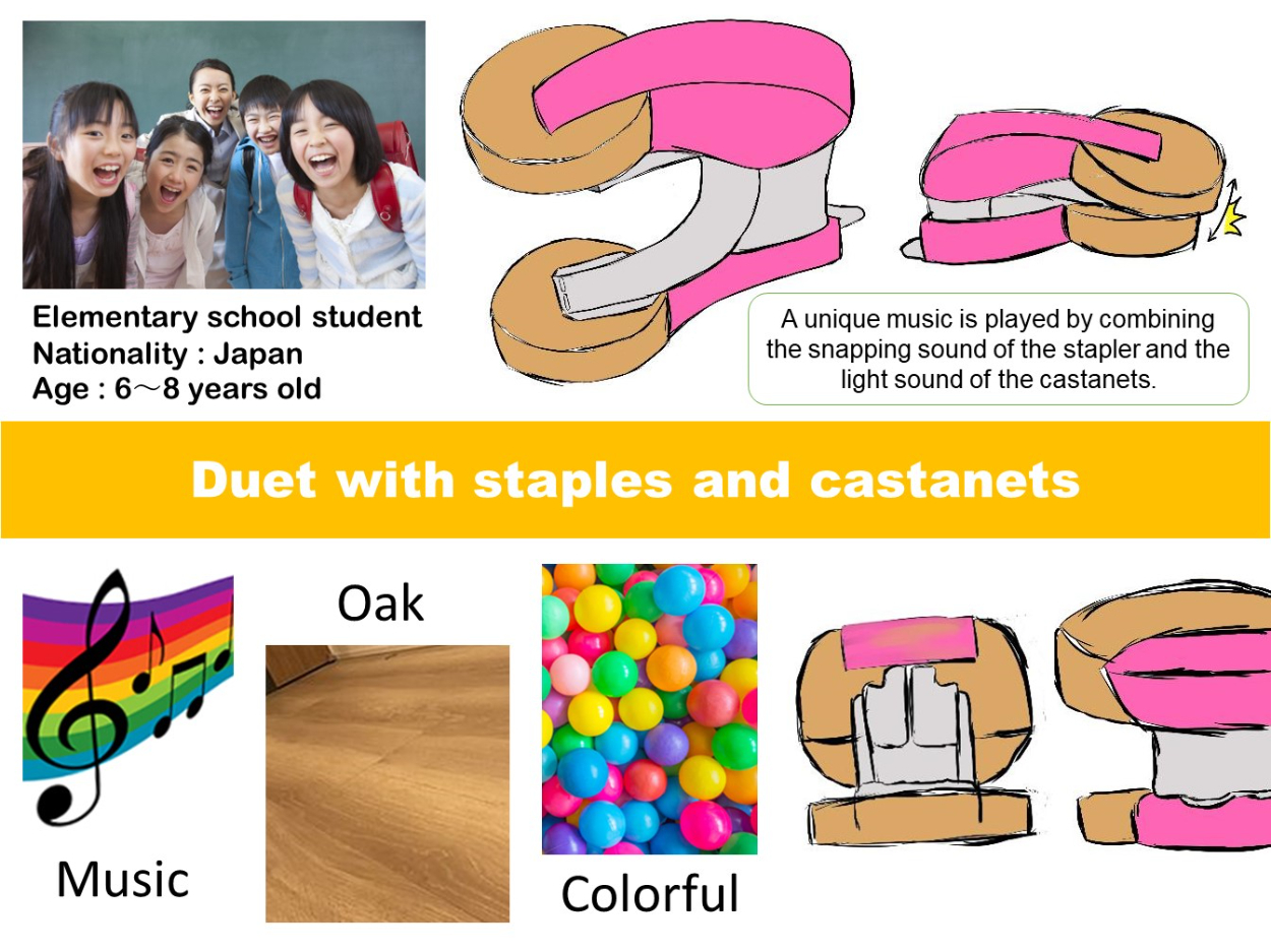 これは、文房具と、文房具ではない製品を組み合わせ、新しい価値を持たせた製品を開発するといった課題に取り組んだ際の成果物です。ホチキスとカスタネットを組み合わせました。