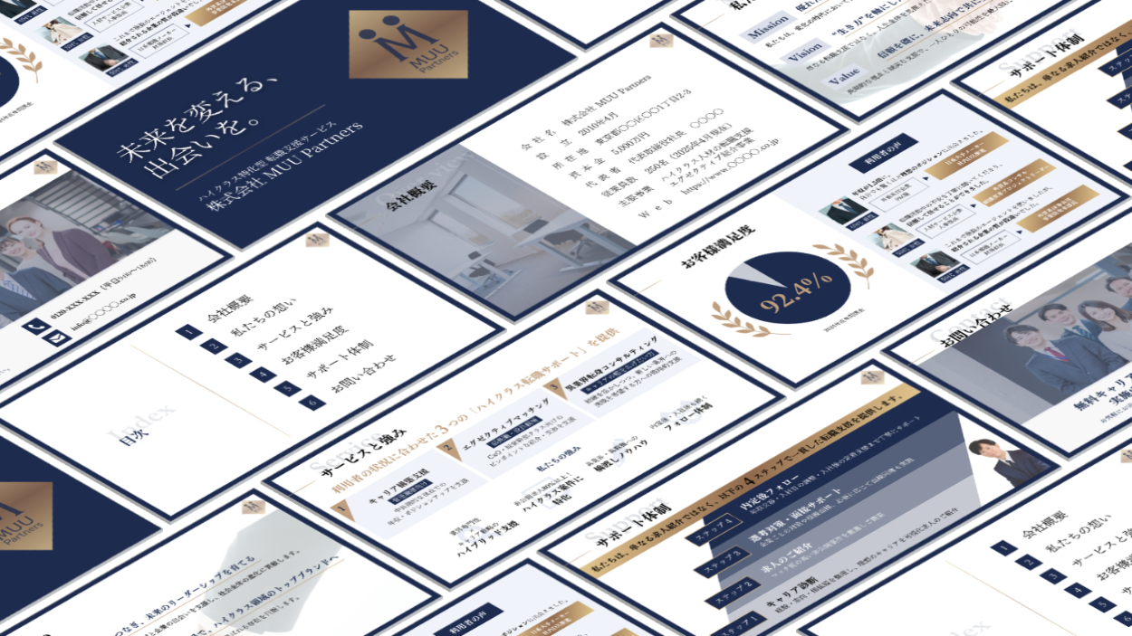 資料デザインコミュニティMUUTOWNの課題として、架空のハイクラス特化型の転職支援サービスの紹介資料制作に取り組みました。【制作期間:12時間/使用ツール:Canva】