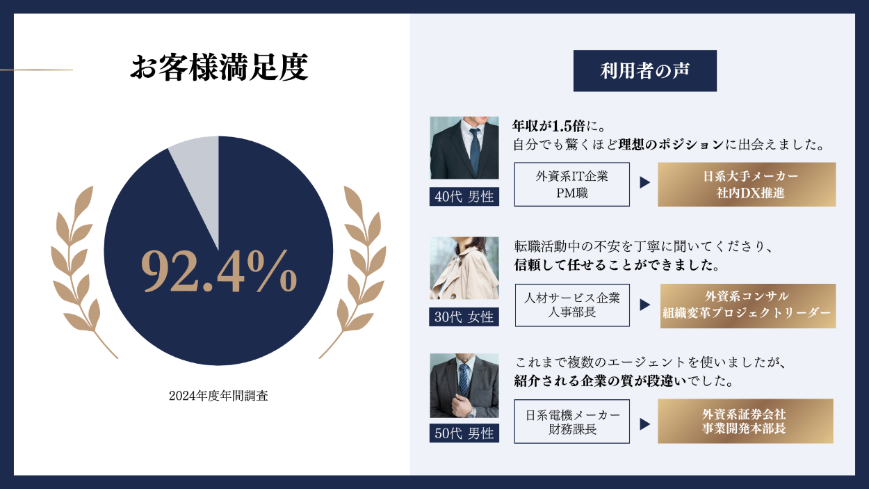 【6/8】高い満足度であることを伝えたいため大きめに円グラフを配置。利用者がどんな転職を遂げたのかが分かりやすいよう、ゴールドの背景で転職後のポジションを表示。